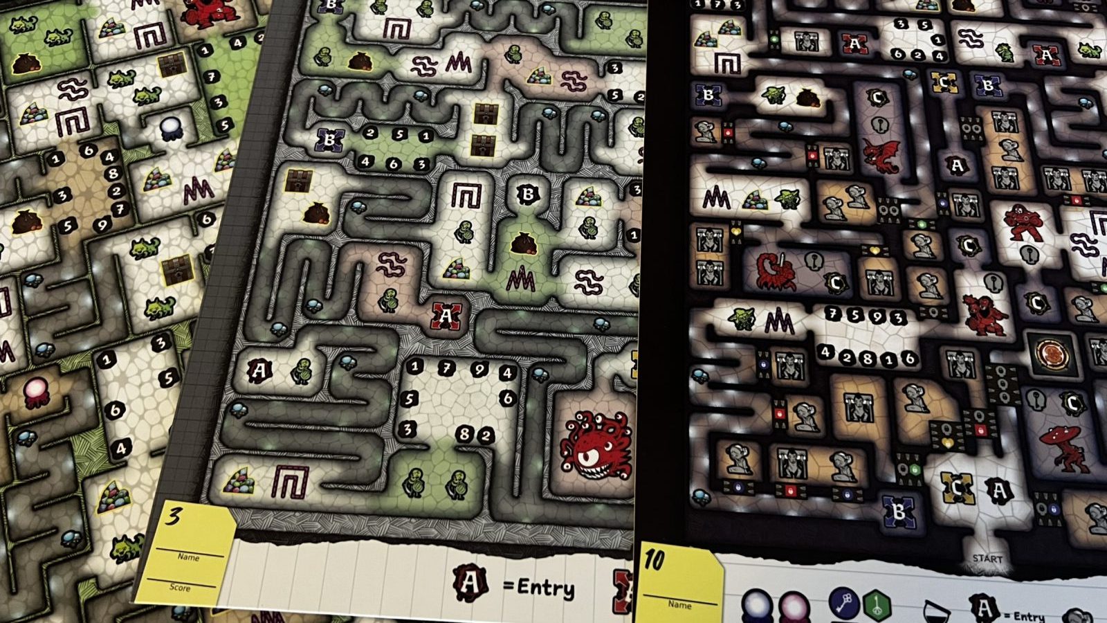 Dungeon Scrawlers: Heroes of the Undermountain (2021) is a licensed Dungeons and Dragons game for 2-4 players distributed by WizKids and designed by Vangelis Bagiartakis, of Kitchen Rush fame, and Konstantino Karagiannis. In Dungeon Scrawlers, players are racing through a dungeon maze with a marker and interacting with the elements of each room to earn points. The scrawler who makes it to the dungeon boss and defeats it first ends the round and the scrawler with the most points after three dungeons is the winner.