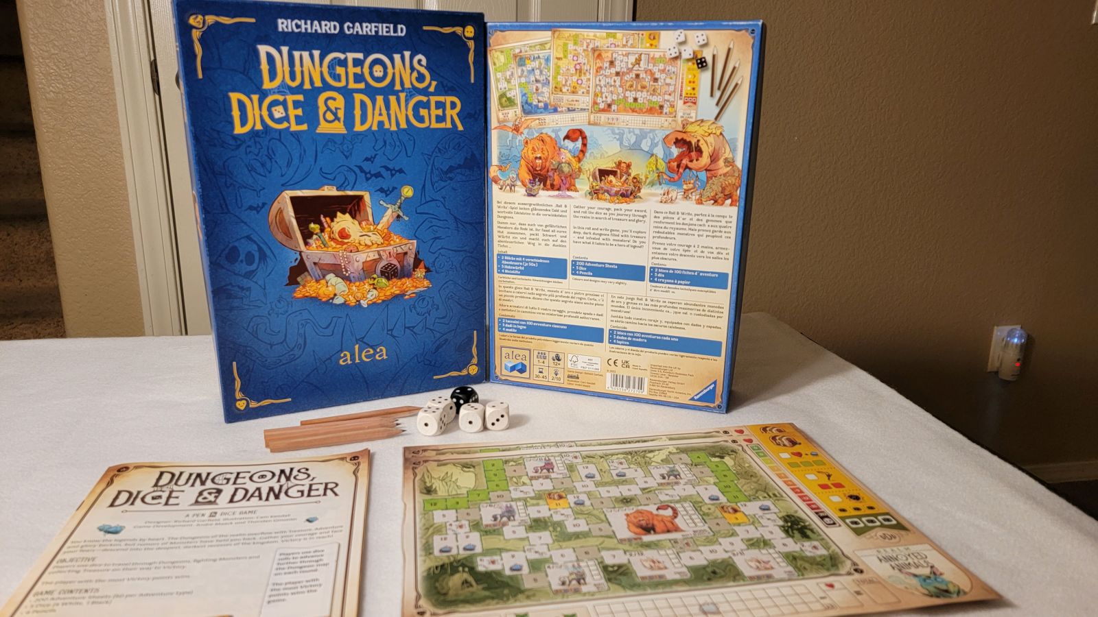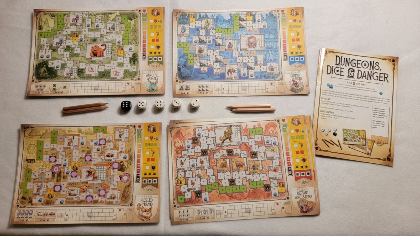 Dungeons, Dice, and Danger has the distinct pleasure of hitting all of the different aspects of being a roll and write really well and not looking back. Designed by Richard Garfield, yes Richard Garfield of Magic the Gathering fame, and produced by Ravensburger Dungeons, Dice, and Danger has a standard to meet – and it does so. The contents first and foremost are simple and provide the easiest setup that almost any game can offer. There are four maps to choose from, everyone plays on the same map, and everyone gets a pencil then you are ready to play.