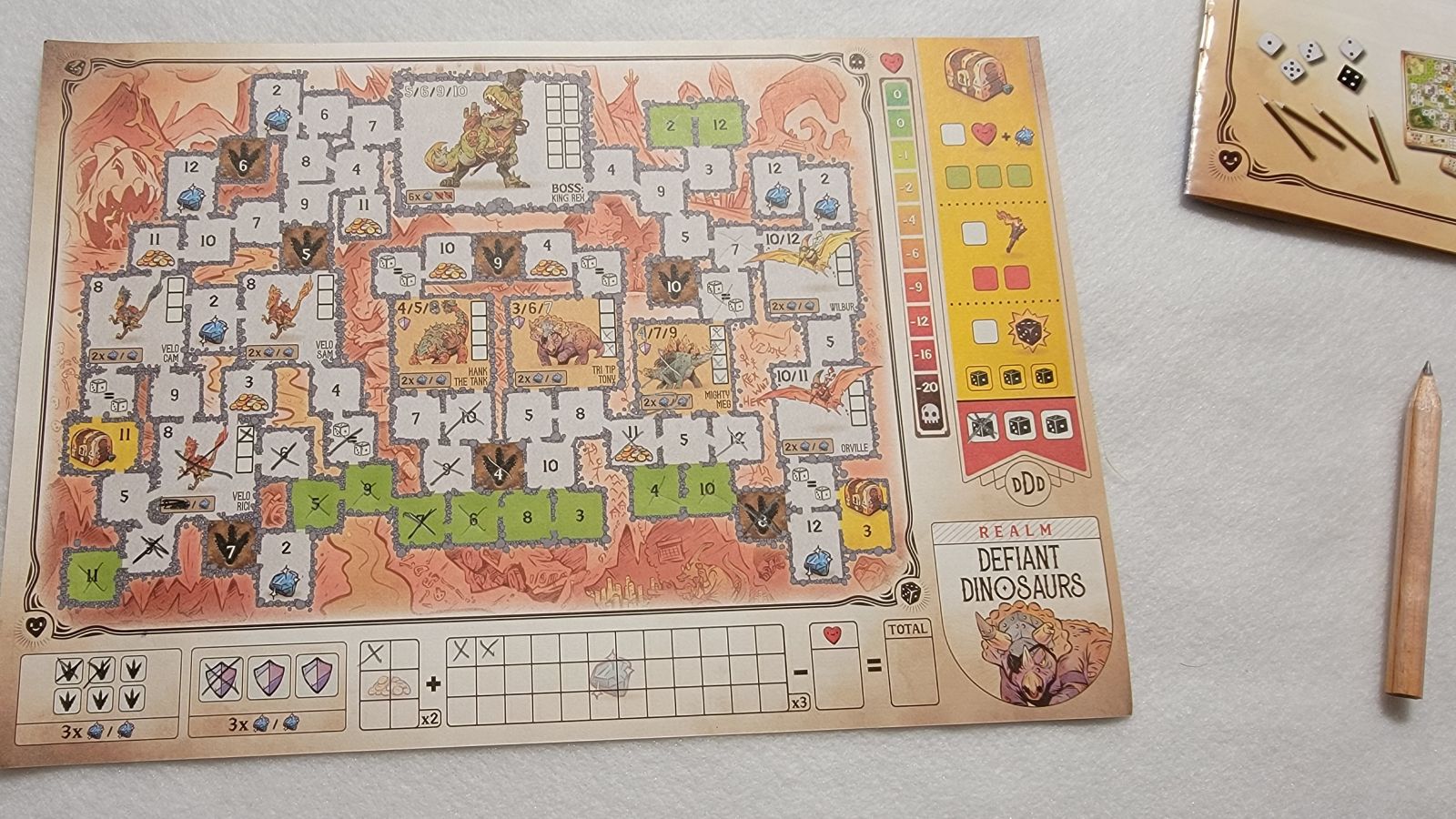 Dead players, you say? Yes, dead players. In Dungeons, Dice, and Danger players who cannot place a number in a given turn must cross off one of the health boxes on the side of the map. It is here that players who take further damage will also start gaining increasingly more negative points. If players however go too far and take too much damage, they will die and are out of the game; this thankfully does not happen much. As players keep rolling and crossing out squares, the game draws closer to the end and when the game does end players count up the amount of gems they have acquired throughout the game and potential other points, depending on the map, then subtract any points from health lost. When this is all said and done the player with the most points is the winner.