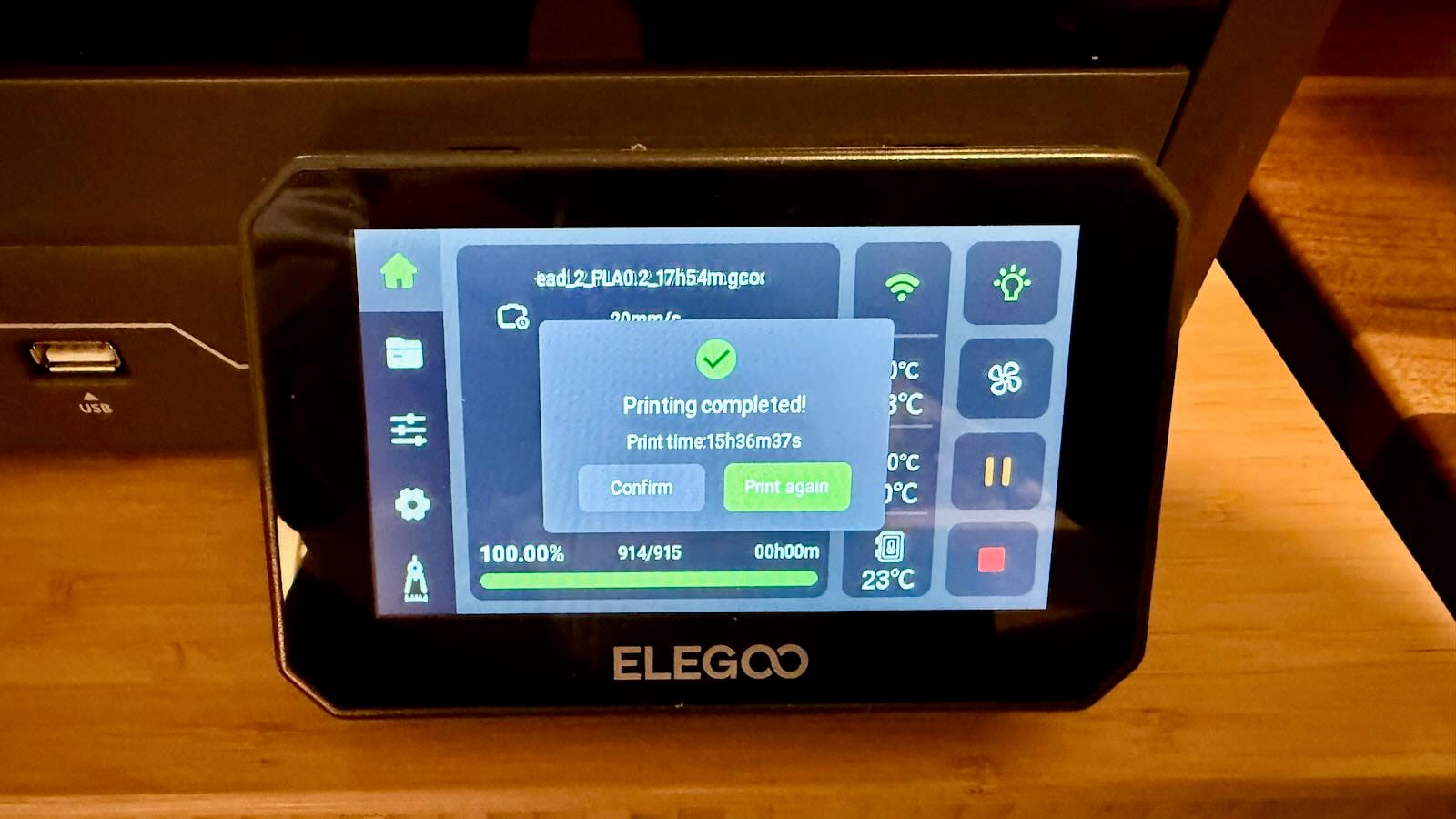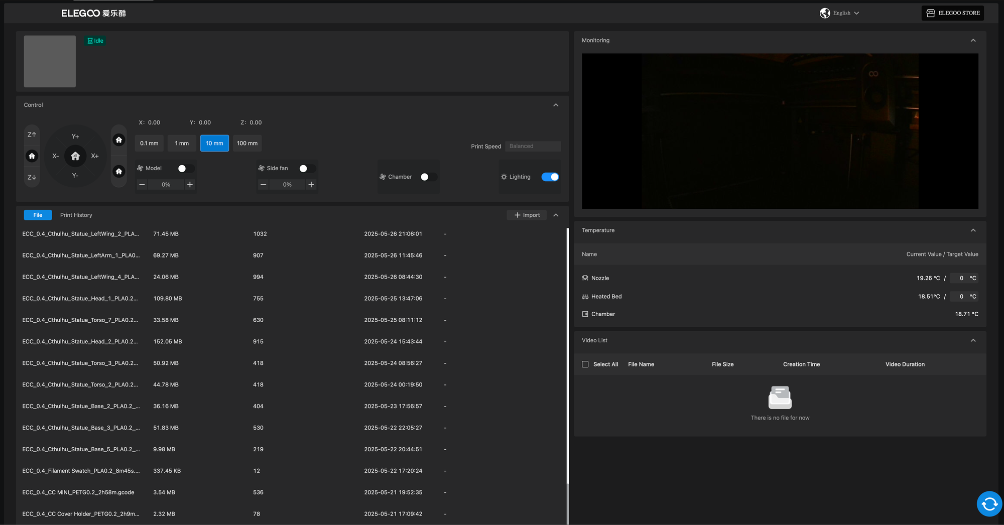 Let's talk software. For all of my printing with the Centauri Carbon, I've exclusively used Elegoo's slicer. Yeah, I know, another slicer to add to the collection but I like having print profiles come directly from the manufacturer. At least it's a fork of Orca so it works well right out of the box installer. On the machine itself, Elegoo uses a proprietary firmware and not Klipper which is kind of a bummer if you're a tinkerer. Proprietary firmware limits customization options, but for non-tinkerers this simplifies the experience. The web interface clearly draws inspiration from Klipper/Fluidd, providing basic controls, file list, print history and video monitoring. As of this writing, the only management tools Elegoo provides are the web UI and the “Device” tab within Elegoo Slicer. There is no dedicated mobile app so you can't check progress while out of the house or push notifications if something goes wrong. With a little bit of effort, I was able to get those features using OctoEverywhere which has been nice.