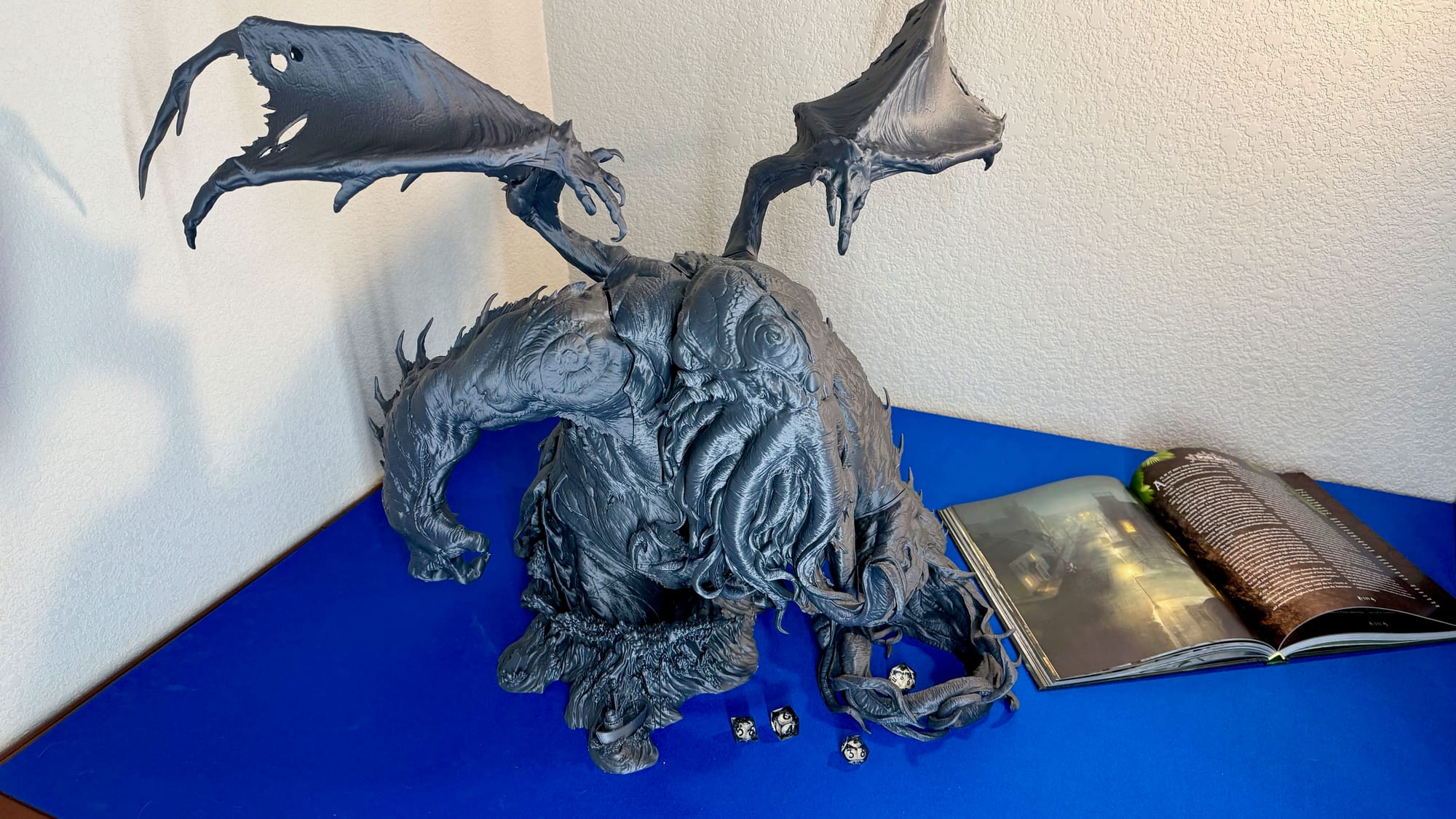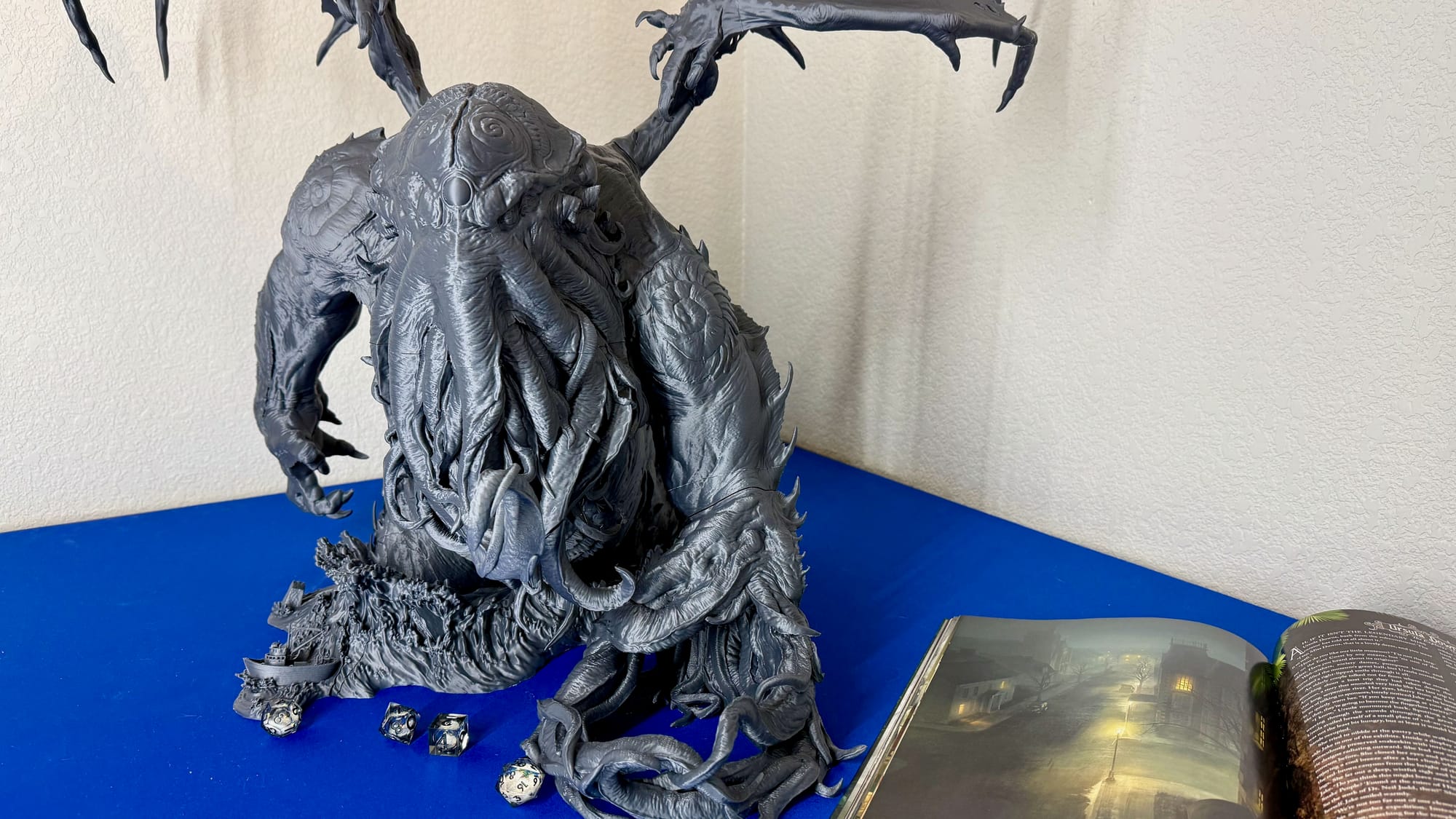 The printer's on-board memory comes with a few sample files to print. I printed a miniature Centauri Carbon which hooks below the waste chute to catch the purges as well as a side-mountable holder for the glass top when it's not in use. These turned out great, as expected since they're tuned for the machine. I wanted to print something bigger ... much bigger to really give it a test, so I settled on printing the Rise of Cthulhu statue and dice tower from Loot Studios. After weeks of printing and multiple spools of filament, the 22" tall and 28" wide Cthulhu was a sight to behold. When assembling Cthulhu I noticed a very minor elephant's foot on all of the prints which is how I discovered the z-offset still needs manual adjustment after the calibration. Oddly, the z-offset can only be changed while a print is running. After I increased the z-offset and elephant-foot compensation in the slicer from 0.10mm to 0.27mm, I've had zero issues going forward. Although it's slightly annoying to have to change the z-offset after every calibration, I've only needed to calibrate once since the initial calibration because I moved the printer to a different table.
