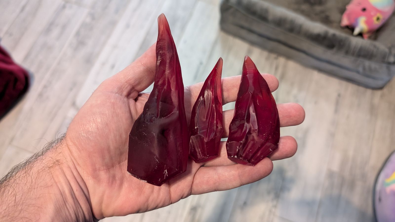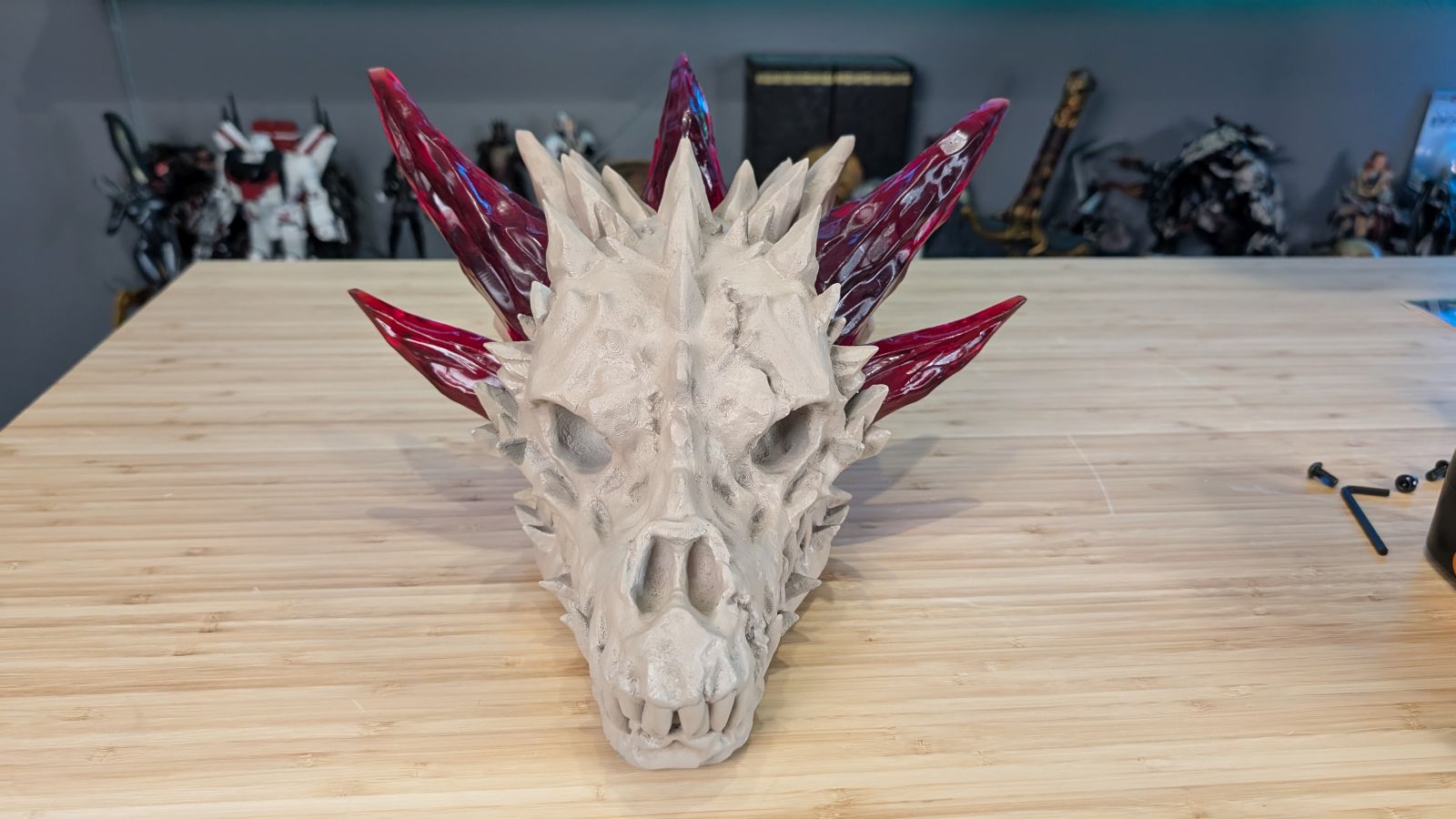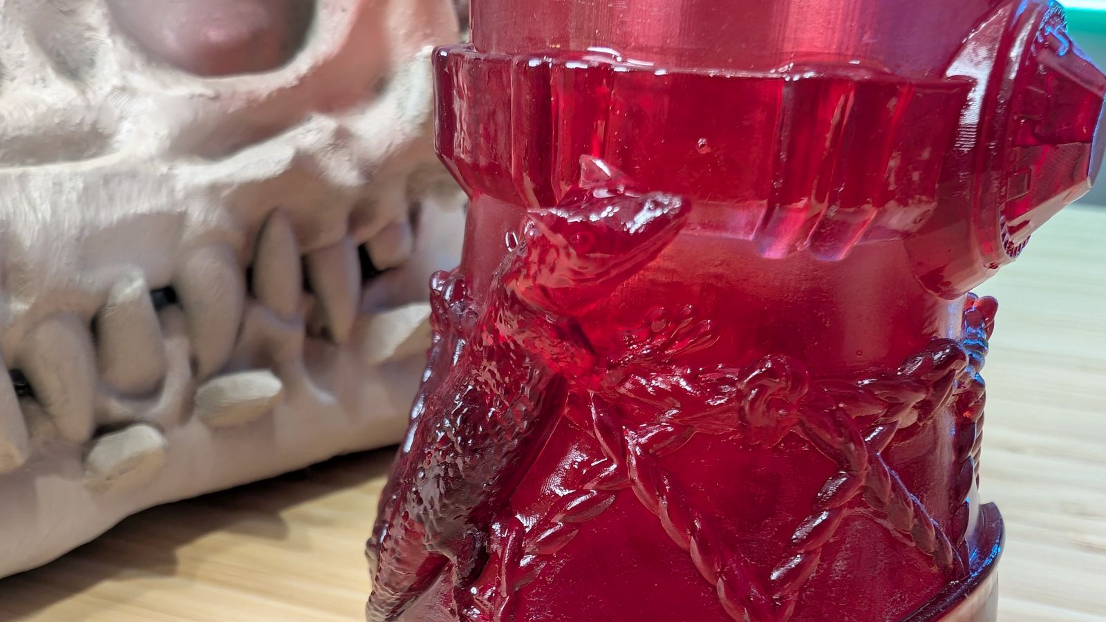 For Halloween I’ve printed some very large dragon heads to help with our theme. I was able to use my large format FDM printer to print the skulls, but any details are best left to a printer capable of higher quality results. That’s where the Mars 5 Ultra comes in. One particular dragon has horns that are a secondary print, but obviously FDM is only going to deliver whatever color I paint it – hardly the flashy accent I needed. Using the Mars 5 Ultra I was able to quickly knock out the horns, scaled up to 125%. Without a single bit of calibration, straight out of the box, I loaded up the firmware update and then the file, hit print, and in three hours I had the first three horns ready to cure. Going with a candy apple red resin, washing and curing them, and then hitting them with a clear gloss finish, these horns were absolutely gorgeous. I could tell you, but where’s the fun in that?
