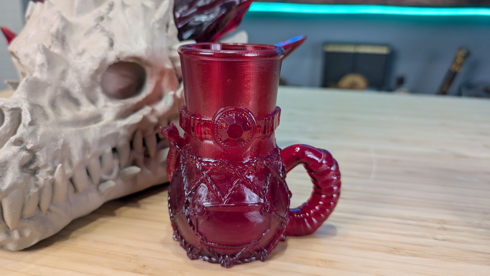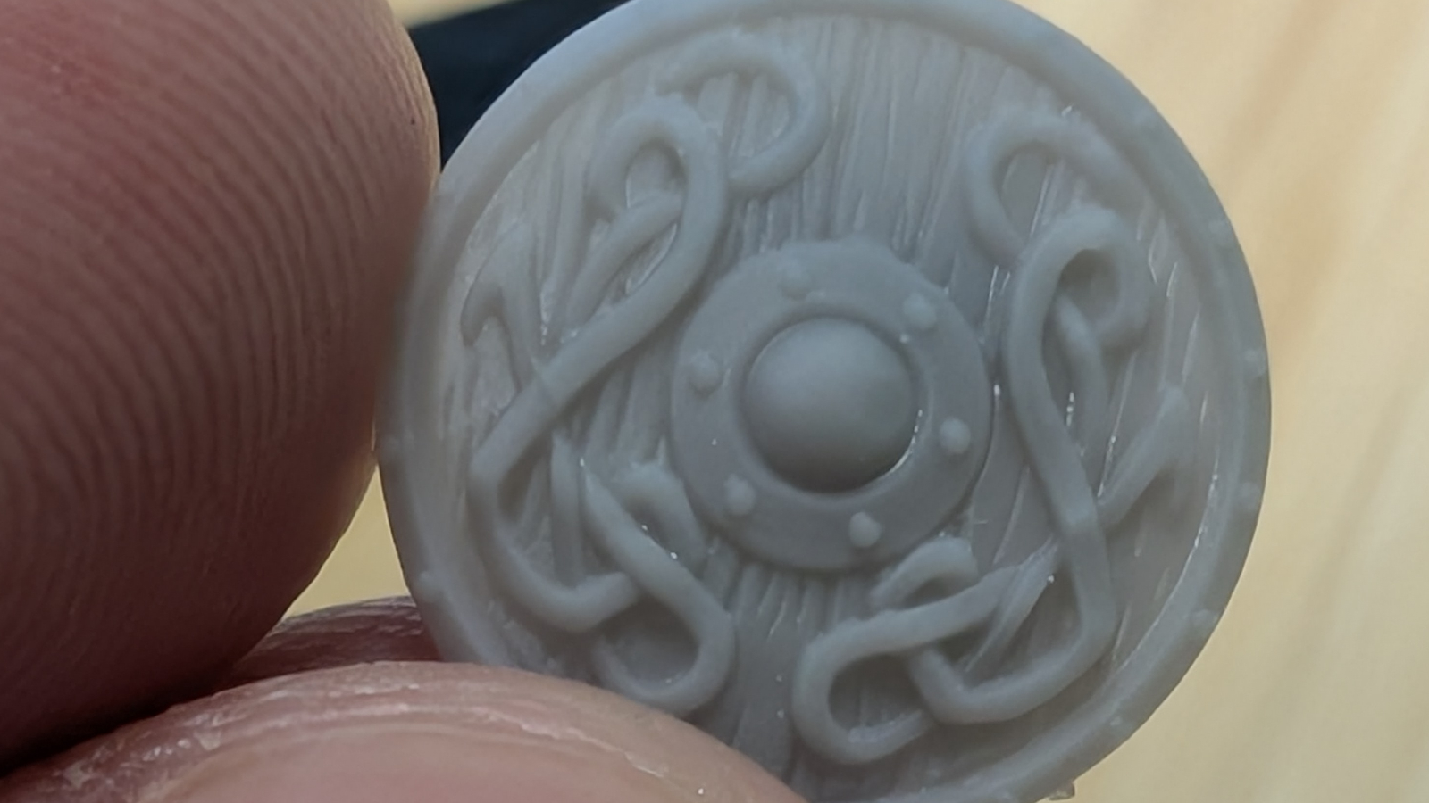 I couldn’t just print out horns and accent pieces and call it a day, I wanted something that would showcase the entire build height of the plate, as well as a print that would showcase just how deep into the detail you can get. To that end, here’s a clear resin goblet (that I won’t drink out of, don’t worry) and the smallest shield piece for a mini I could possibly come up with. As you can see with the goblet, it’s of a fairly large size, and with lots of awesome accent details in things like the lizard on the side. It’s printed as one piece, with very few supports. I’ll let you judge for yourself:
