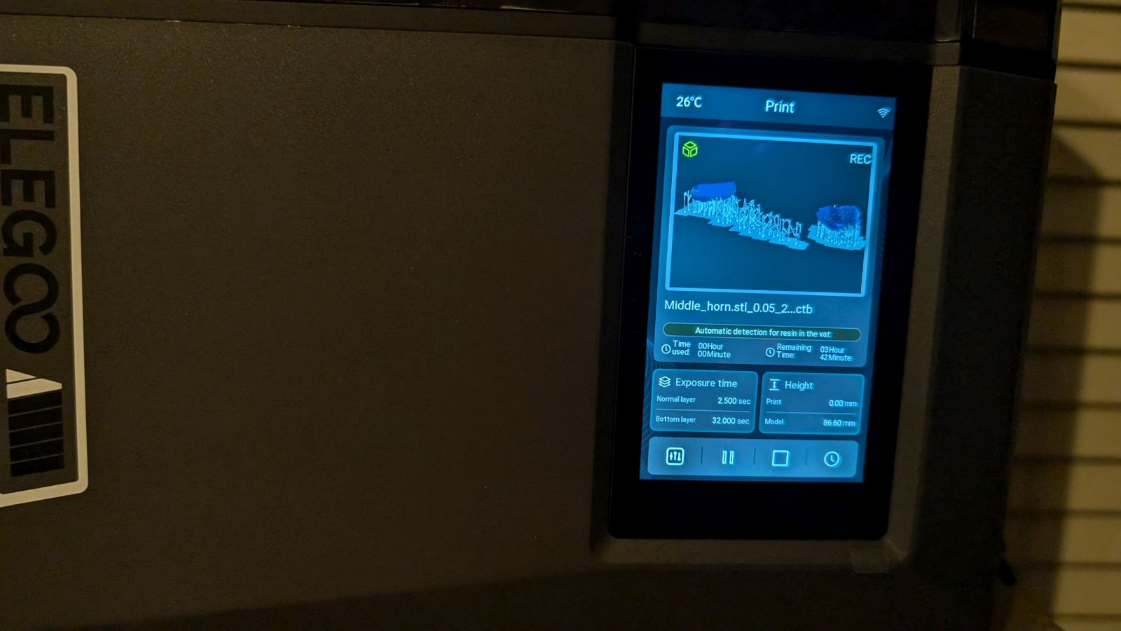 First, you’ll see your print appear on the touchscreen – a nice last-second crack check that also shows off a number of important stats such as the bottom layer count (how many extra-long exposed layers to ensure the print sticks), how long that extra exposure lasts, as well as the normal exposure (25 seconds for the former and 2 seconds for the latter, for instance), and even any light off delay, if you needed it. You can also see the model’s size, approximate time elapsed and remaining, and a small picture of the finished item. It’ll also flash a small red record light to let you know the time lapse is recording. Once it’s rolling, that screen flips to a percentage complete, how many layers have been printed, how many layers remain, how much time has passed, and how much time remains. It also tracks the temperature, which could be important in an enclosed space, or when it could be too cold to effectively print.