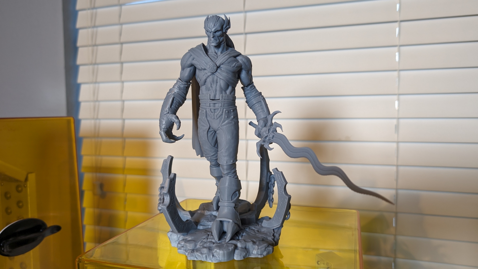 Heading back to the printer for one last print without any calibration whatsoever I turned to a personal favorite series of mine – Legacy of Kain. Kain is the main protagonist of the Legacy of Kain and Soul Reaver franchises, and has long been forgotten by Square Enix which makes me very, very angry. Just the same, I can print the titular character in resin for all time. This time around I decided to print him in multiple pieces, covering the entire plate, and again, with no settings changes. I threw everything on the plate, hit “auto arrange” and “auto support”, sliced it, and hit print. Vae Victis! The figure printed perfectly, as did the base on a second plate run. See for yourself: