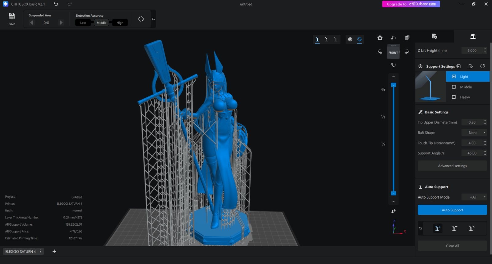 The rook isn’t an overly complicated print, and I’ve had good luck with prints right out of the box before, but throwing a more complicated, poorly-supported, solid piece, I’d throw it off, right? I brought this Anubis into Chitubox, hit it with an auto-orient and applied auto-supports, sliced it and hit print.