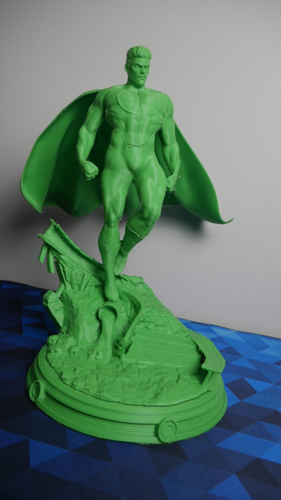 Seeing as I printed some tiny models, I had to see how the v3 would handle a big model. I found this multi-part statue of Omni Man on Thingiverse, dropped it in the slicer, and sent it. Well, sort of. This model was absolutely not designed for FDM printing and I had to do some work to clean up floating edges and non-flat slices as well as figure out the best orientation for supports. Settings were again all stock though. I was really quite impressed with how Omni Man came out. With zero extra calibrations and complete stock settings, he’s almost flawless. You can see a bit of sag on the edge of the waistline where the supports were. The slight stringing was still present but not as bad. That’s it. All of the pieces fit together perfectly, the massive cape that I had to cut in half to fit on the printer included. It’s an impressive print for putting in almost no effort into setting it up.