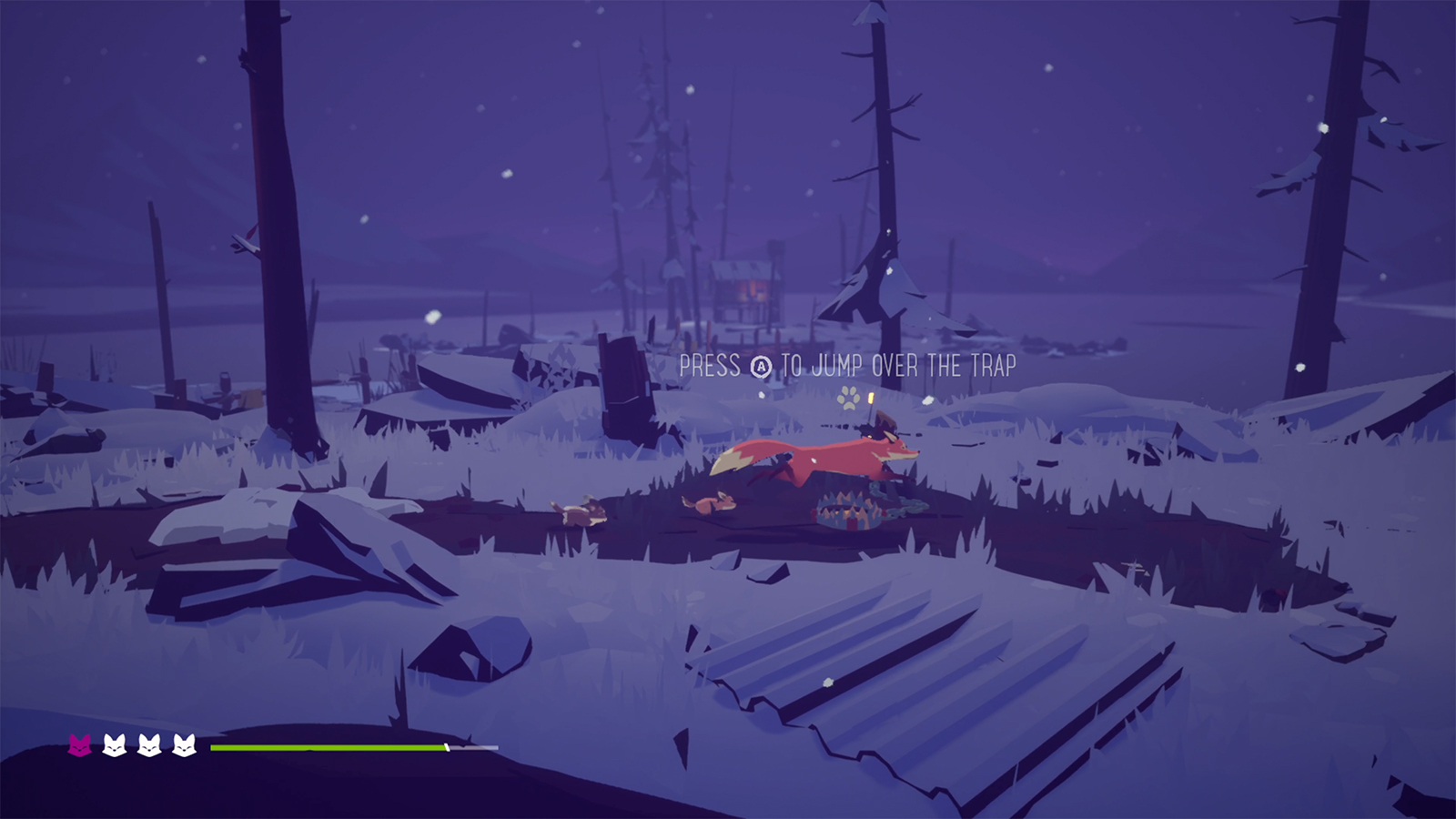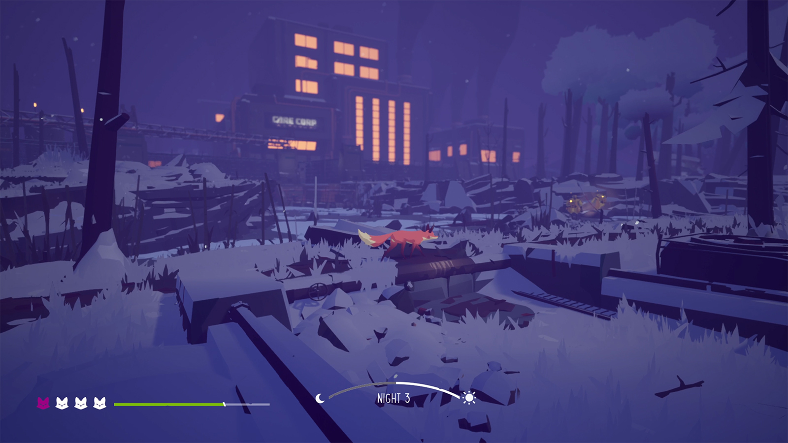 Your new fox den is located in an area that’s been visibly blemished by humans. Tractors take up space like a construction zone, plastic cups and bottles litter the river, and a factory ominously sits in the background emitting black smoke into the air. And what you’ll find is that this abandoned area is, in fact, populated. But it’s only populated by a few people and they are clearly up to no good. While I won’t get into spoilers, I must mention that one of the catalytic events that happens very early in Endling is one of your newborn pups is kidnapped. That’s what gives you a reason to explore the area. But this plotline doesn’t end with any revelations about mankind’s gradual destruction of the environment. It is sad and it broke my heart, but I felt confused once the subplot ended, wondering how it tied into the grander message of our impact on environmental destruction.