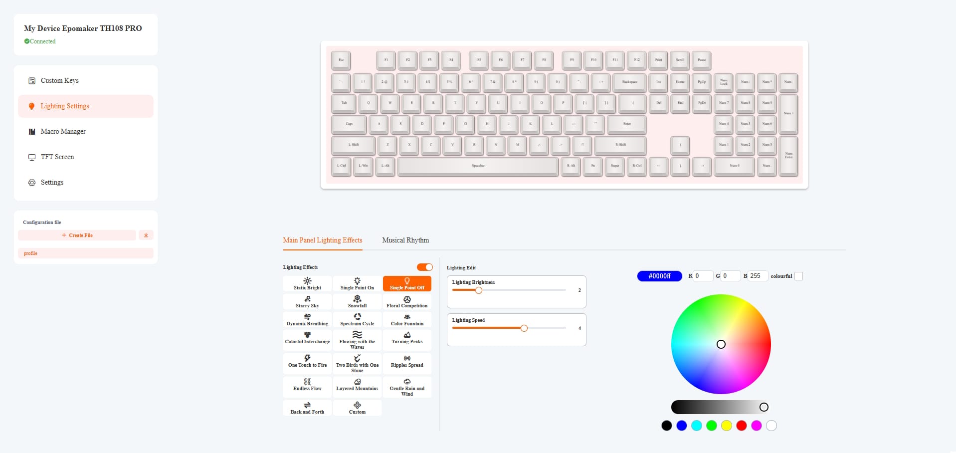 As with most modern keyboards, the TH108 Pro offers a wide range of lighting options. To my RGB-loving pleasure, I think it actually offers more options than most standard keyboards. You can adjust the keyboard backlighting to be different colors and patterns, of course, but the TH108 Pro also lets you adjust RGB for the side panels (effectively giving the keyboard a sort of adjustable ground-effect lighting option) as well as lighting options surrounding the built-in screen.