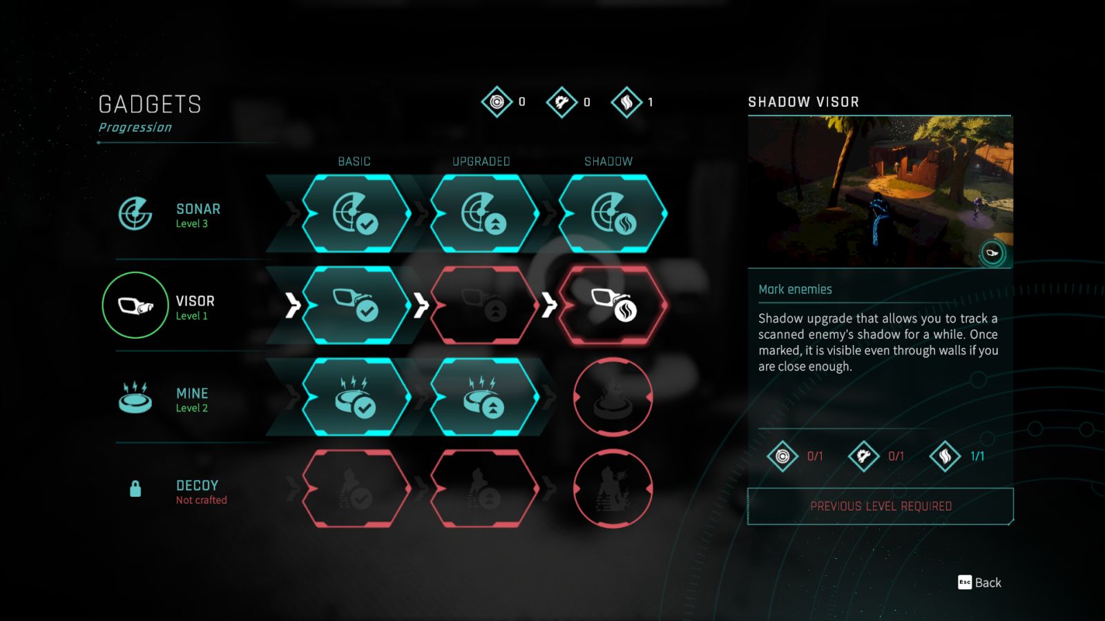 Now it’s time to get into the shadow powers and gadgets, which are the main tools Ayana uses to get an edge over her much larger, much stronger Sym opponents. Starting with gadgets, Ayana has access to a sonar pulse that reveals enemies, a visor for tracking them, a land mine for stunning them, and a decoy to distract them. Each of these gadgets has three levels, the initial unlock of the basic gadget and two upgrades in a linear path. For example, the level three upgrade of the land mine fully consumes in shadow whichever Sym was unlucky enough to step on it.