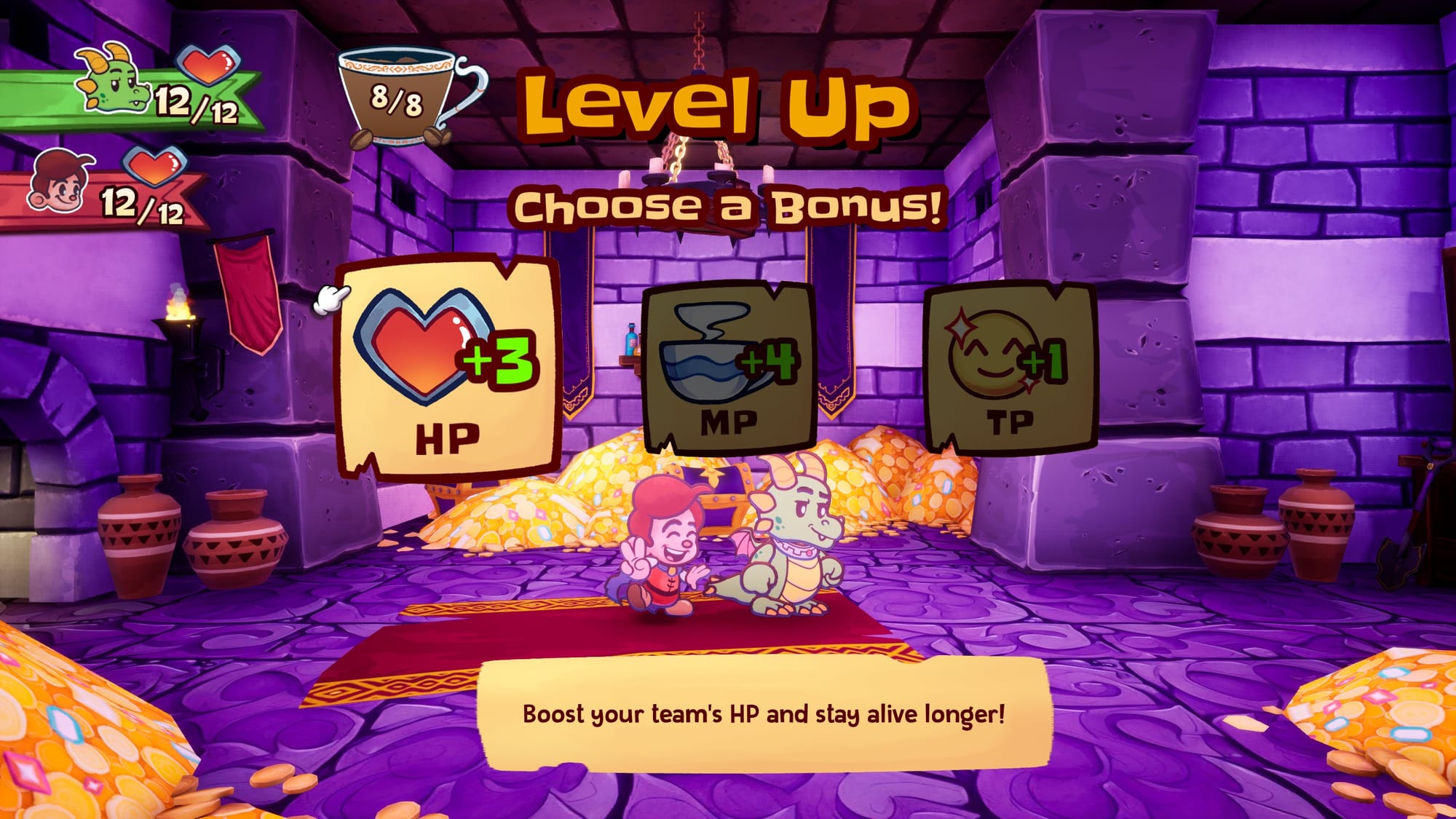 As you travel the world, you’ll earn XP and level up. Each level up grants you the ability to improve your HP, MP, or trinket points. Trinkets are accessories that can be worn to grant new skills or improve your stats. MP, normally short for “mana points” or “magic points”, is short for “Mocha Points” here. That’s right, our heroes are fueled by caffeine, just like many of us. While your party will grow in size as the game progresses, you can have two characters in combat at any given time. Each hero has abilities that can be used in different situations, so knowing when to swap characters on the fly will be to your advantage.