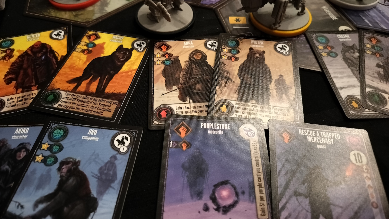 Whenever a corrupted tile is explored, which is most of them, a random corruption token is drawn from a bag and put on it as well. This corruption blocks one of the abilities of the location, but can be cleared with a card with the vanquish ability, which expends that might and guile you’ve been saving up, and gets your the cleared token.