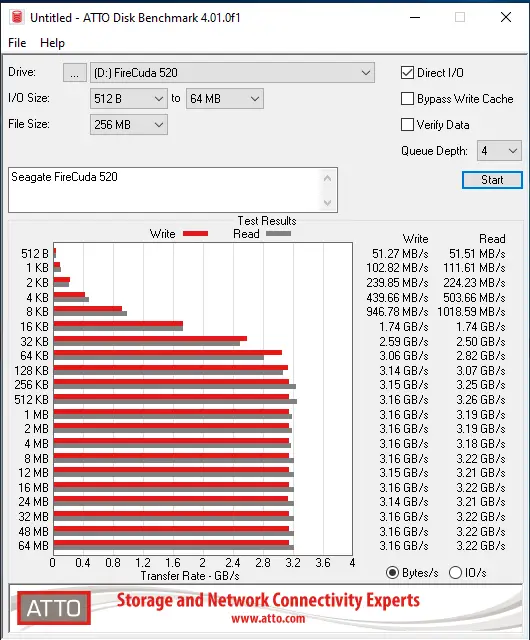 I like to do cross-comparison with tried and true ATTO Benchmark as it can perform direct I/O tests across many different block sizes, and across multiple file sizes. This time we’ll compare the 520 on an Intel system against the Seagate 520 on a Ryzen-equipped motherboard.
