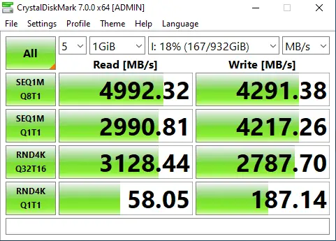 As you can see, there is a 69 percent increase, going from an already-impressive 3472 MB/s on the FireCuda 510 to an eye-wateringly fast 4992 MB/s for sequential reads on the FireCuda 520. Write speeds saw a similar increase (75 percent) with write speeds hitting 3236 MB/s for the 510, and 4291 for the 520. Re-running the ATTO benchmarks several times, and at empty, mid, and full states yielded strikingly consistent results, meaning the device can read from anywhere on the NAND with the same efficiency.