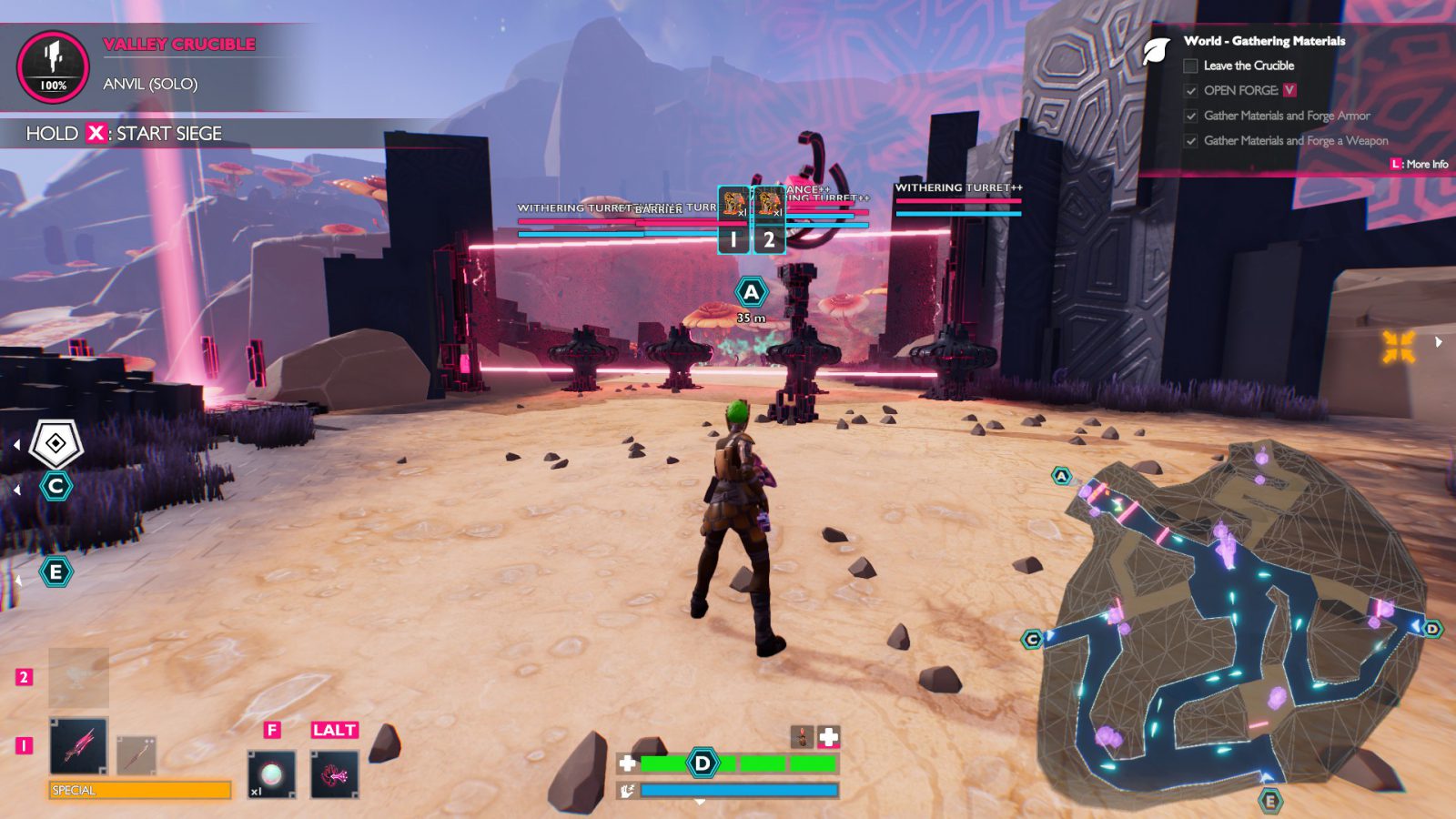 The tower defense portions of Eden Rising (called Sieges) take place in your base and revolve around protecting a structure at the center called a Crucible. In each of Eden Rising’s environments — large maps that are connected but essentially self-contained — you’ll find a new Crucible with its own Sieges to complete. You can place towers with a mix of offensive and defensive capabilities anywhere you want within your base, then initiate the Siege at your leisure. For a game built entirely around tower defense, the towers you can build seem pretty rudimentary. You have towers that deal damage, stun, increase damage to enemies, and heal you. Towers get more complex and situational as you progress, but none of them really stood out. When you’re in a Siege, crafting takes a back seat to combat. It just takes too long to craft and place towers to make on-the-fly defense building viable, plus the maps are so large that by the time you run to plug a gap at one end, you’ll have sprung a leak at the other.