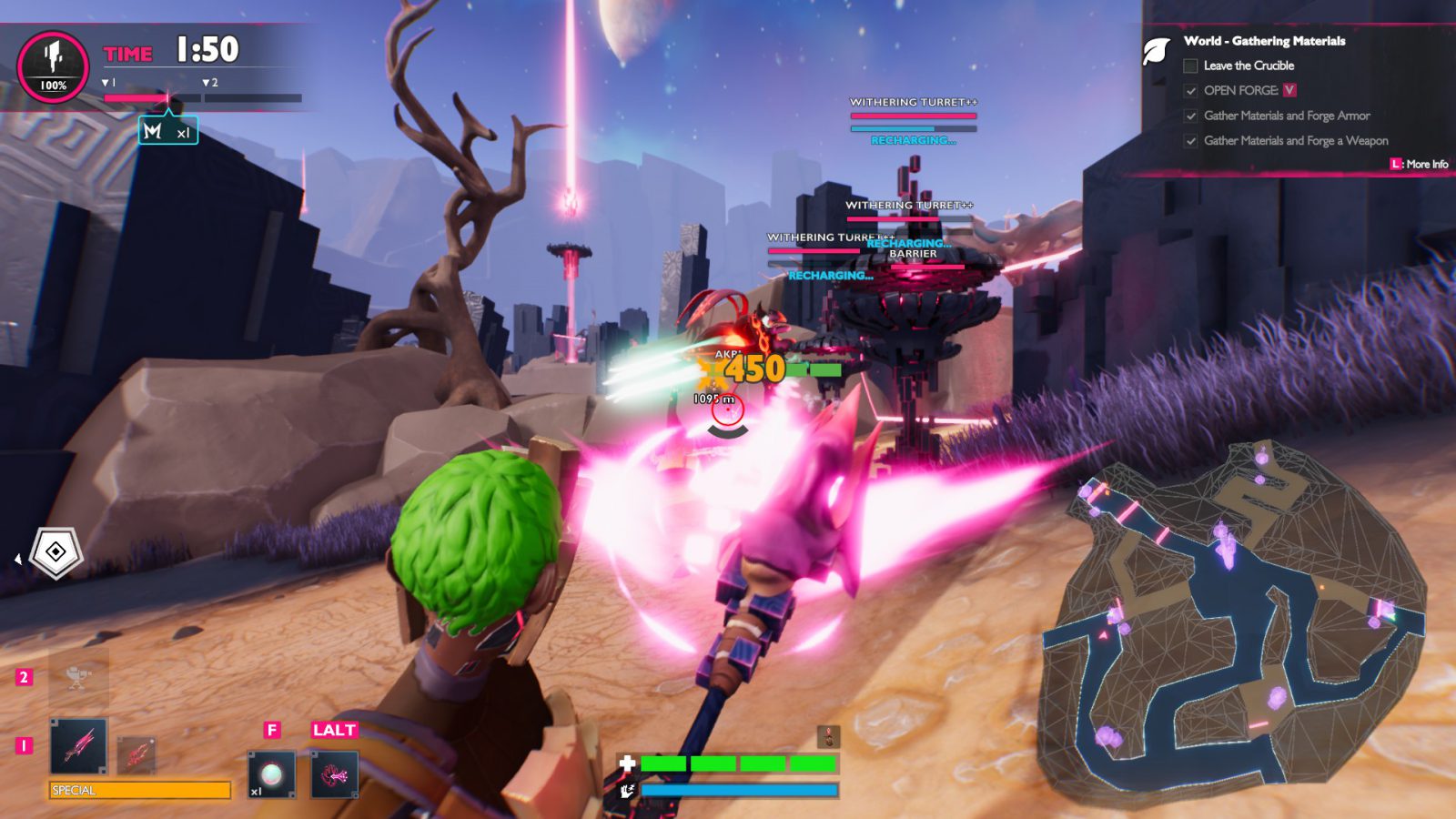 This loop gives the whole game a disjointed feeling. Your progress through Eden Rising is determined by the number of “links” that you earn by completing Sieges; just exploring the open world won’t really get you anywhere. Still, every few Sieges, you’ll have to venture out into the open world to replenish your stocks so you can build new towers and upgrade your gear. It all makes the open world feel completely devalued. You’re not exploring this strange alien planet and discovering new tools or artifacts; you’re just plundering it for a set number of the exact items that you need to build a specific tower or craft a certain weapon.
