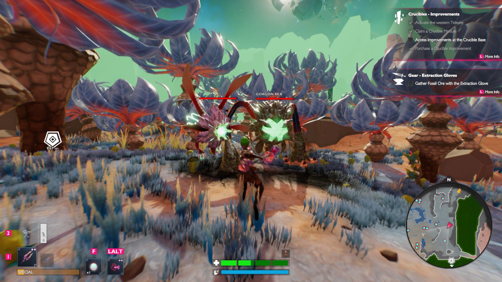 It’s a shame how little of the game works, because the world itself is fairly interesting. There are tons of interesting designs in the flora of the world, from the braided roots of trees to the multicolored leaves of giant plants. The art style in general looks great; it reminds me somewhat of the design of Ashen or Absolver, and a lot of the weapons and armor look realistically cobbled together from the pieces you find around the world. Unfortunately, it doesn’t really mesh in a satisfying way. It’s more a jumble of disconnected designs than a satisfying whole. The interesting art style doesn’t extend to the planet’s fauna either. You’ll fight the same set of creatures hundreds of times between exploring the open world and defending your Crucible, but none of them are that visually appealing. In the early game, nearly every creature is based on the same core jellyfish-like design, and even when they get a bit more diverse later, their designs tend to be muddy and bland.