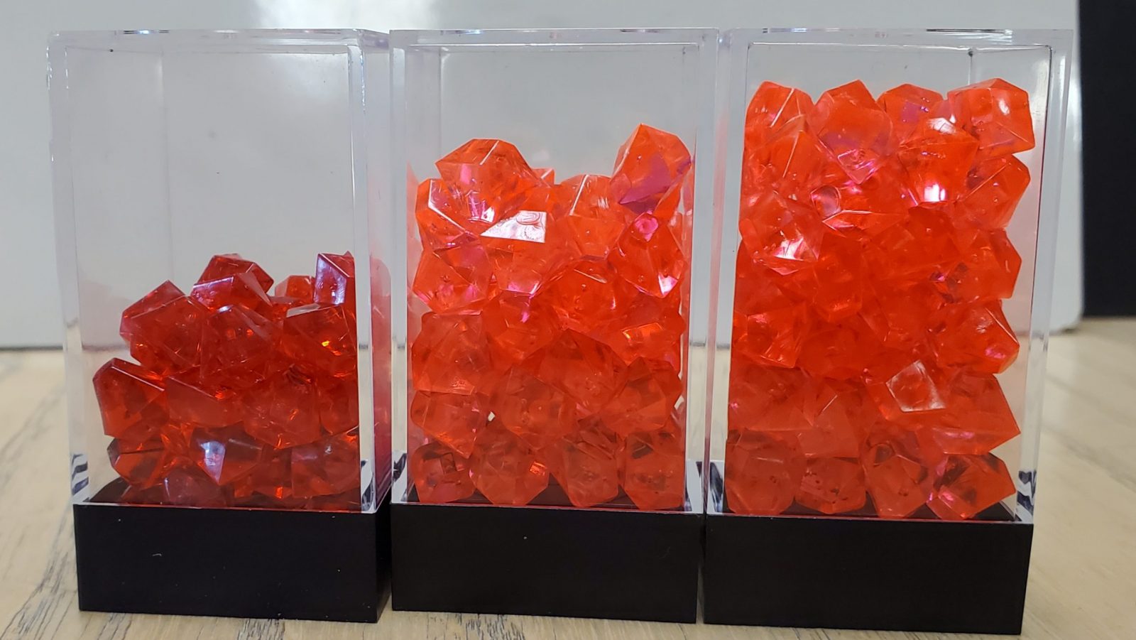 Red crystals on the left, pink crystals in the center and on the right.