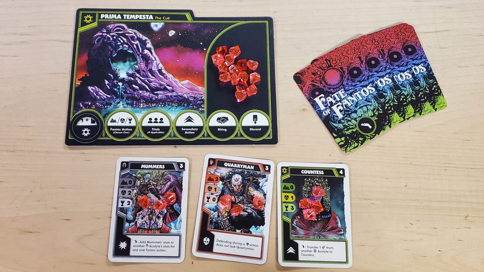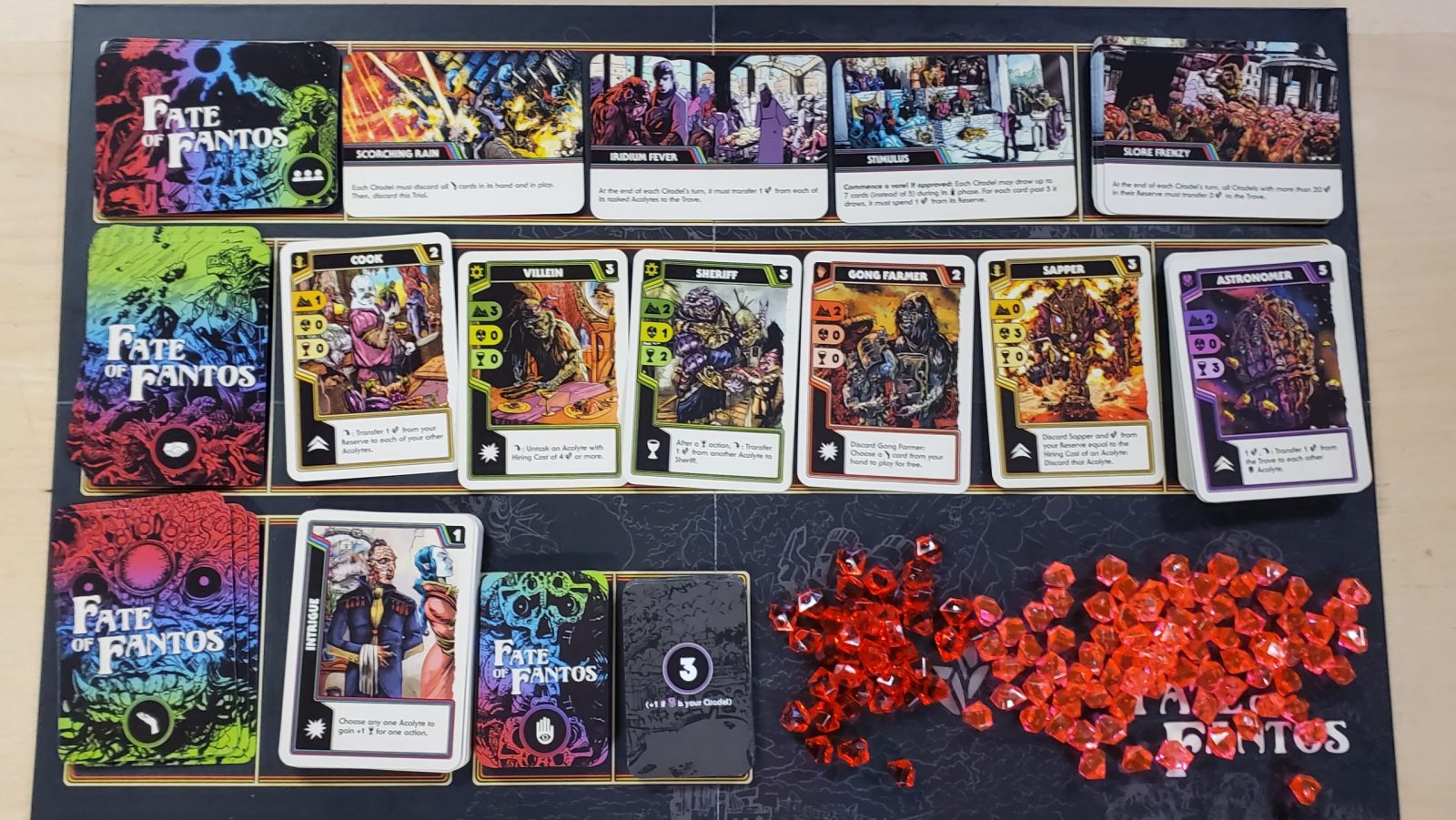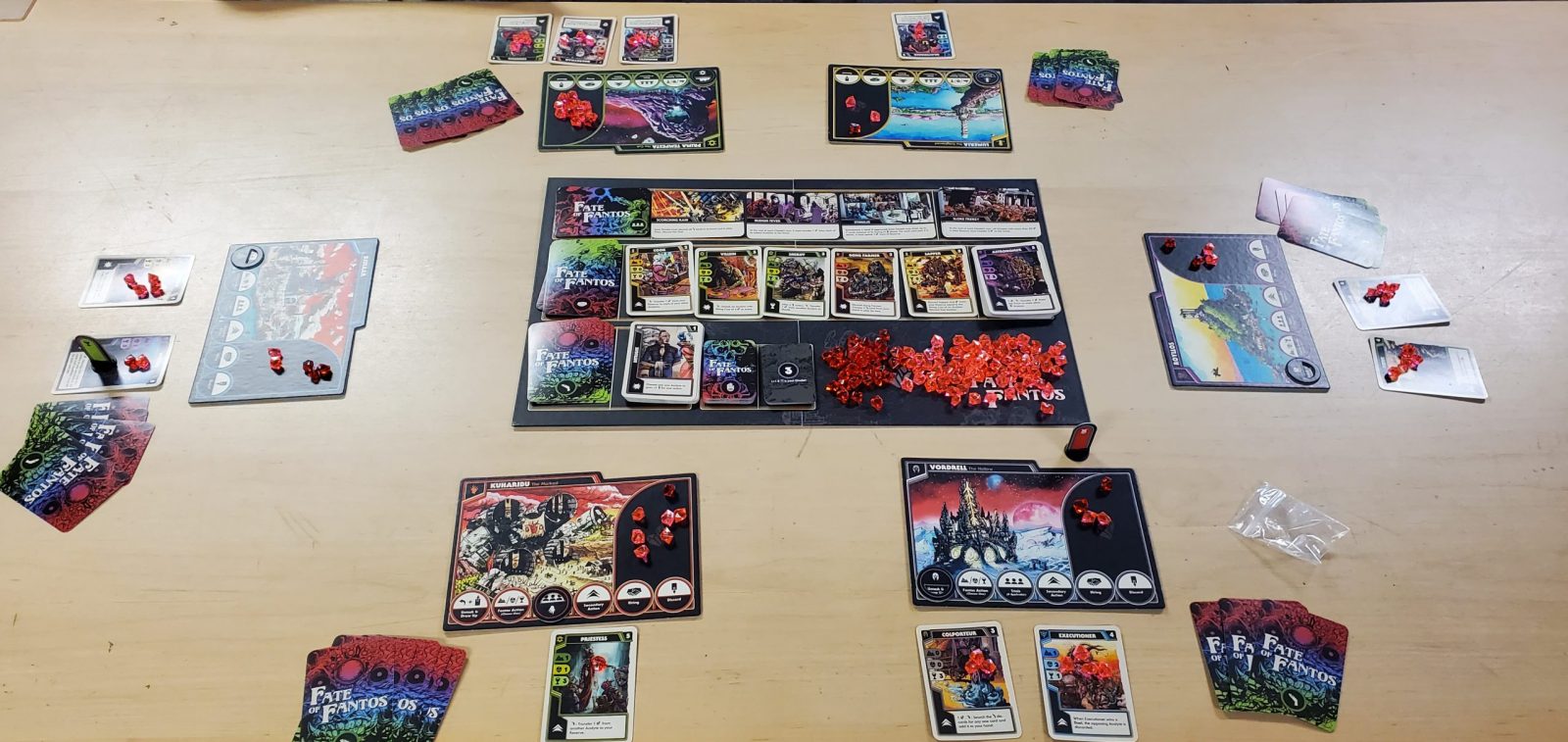 Unlike a lot of modern games, Fate of Fantos is a 3-6 player game. There is no two player mode that one might expect in most CCGs let alone any solo mode like many people might expect in many modern games. Beyond that, I think the game is at it’s most technically/mechanically interesting at 6 players and… good luck finding 6 players who are going to be eager to sit down and play a long, slow, mean game that requires either a lot of upfront study or tons of repeated plays to get a good feel for all the potential mechanical interactions in order to play reasonably competitively and intelligently.
