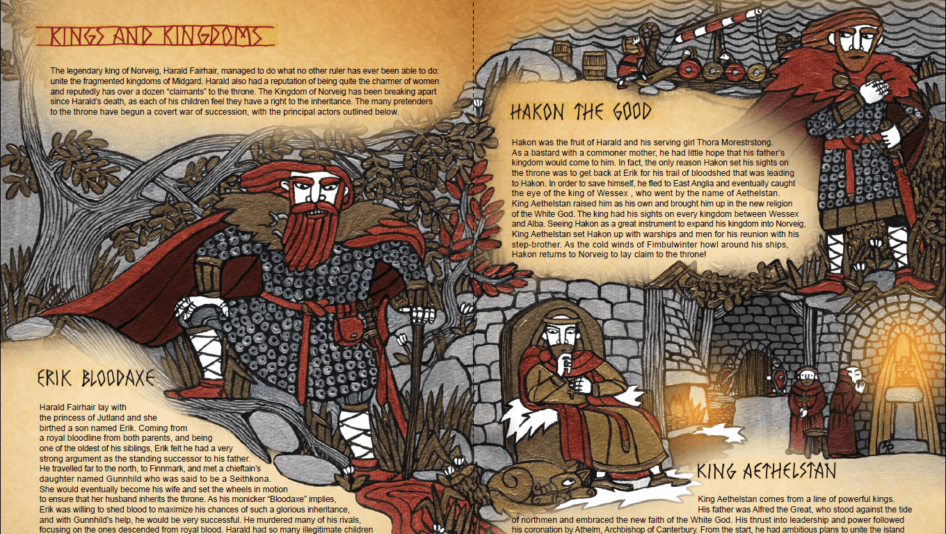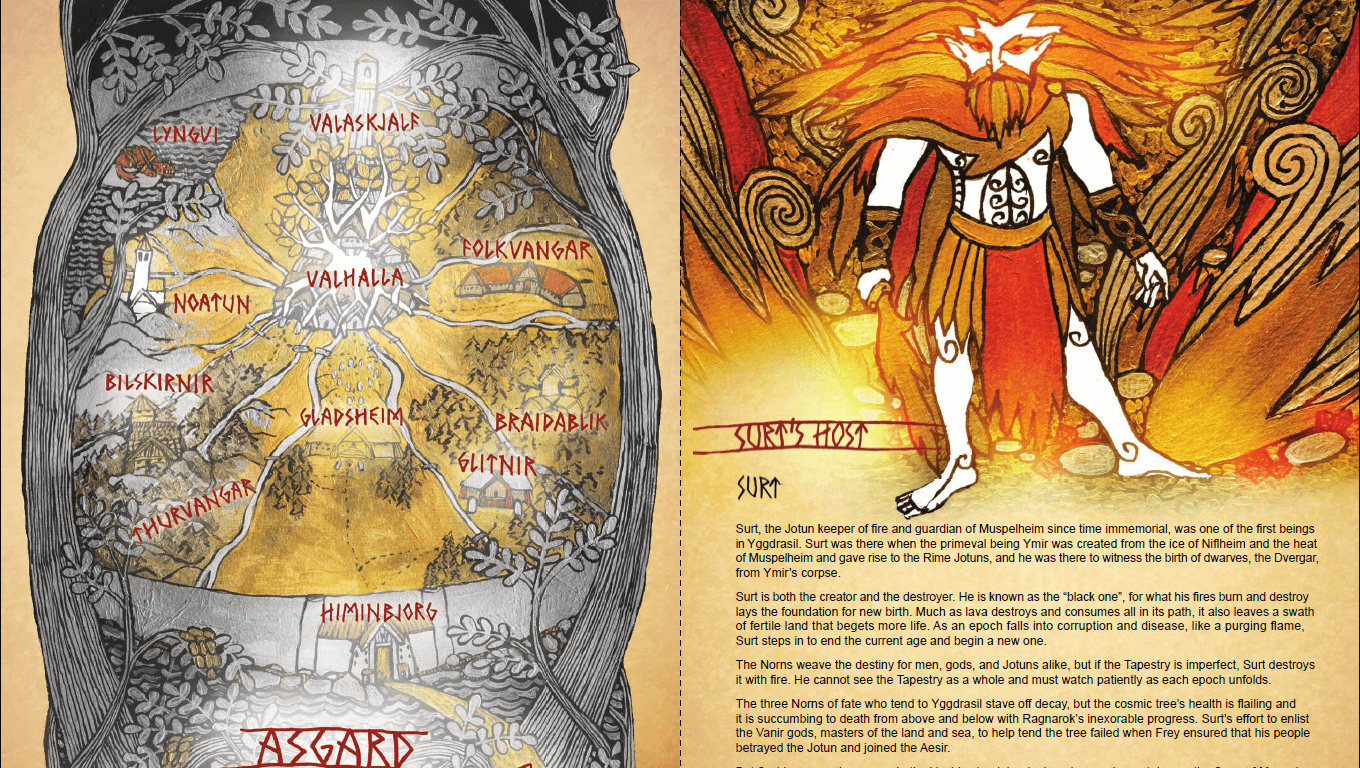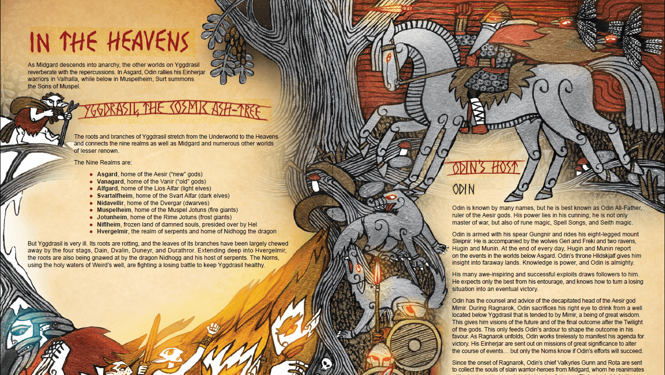 The core book itself stands out in many ways, chief among them being in its presentation. Melding the twisted angles of Viking imagery with the vibrant colors of illuminated manuscripts, the first 80 pages of the book are an astounding joy to behold. In terms of pure artistry, this book is one of the best RPGs I’ve ever read. It’s just page after page after page of evocative, culturally informed pieces that sell every bit of the game’s intended fantasy. This is a world of adventure, terror, and legend, sprawled across its maps and character sheets in the same style of the setting’s art. The art alone goes a long way towards Fate of the Norns price tag of $75.