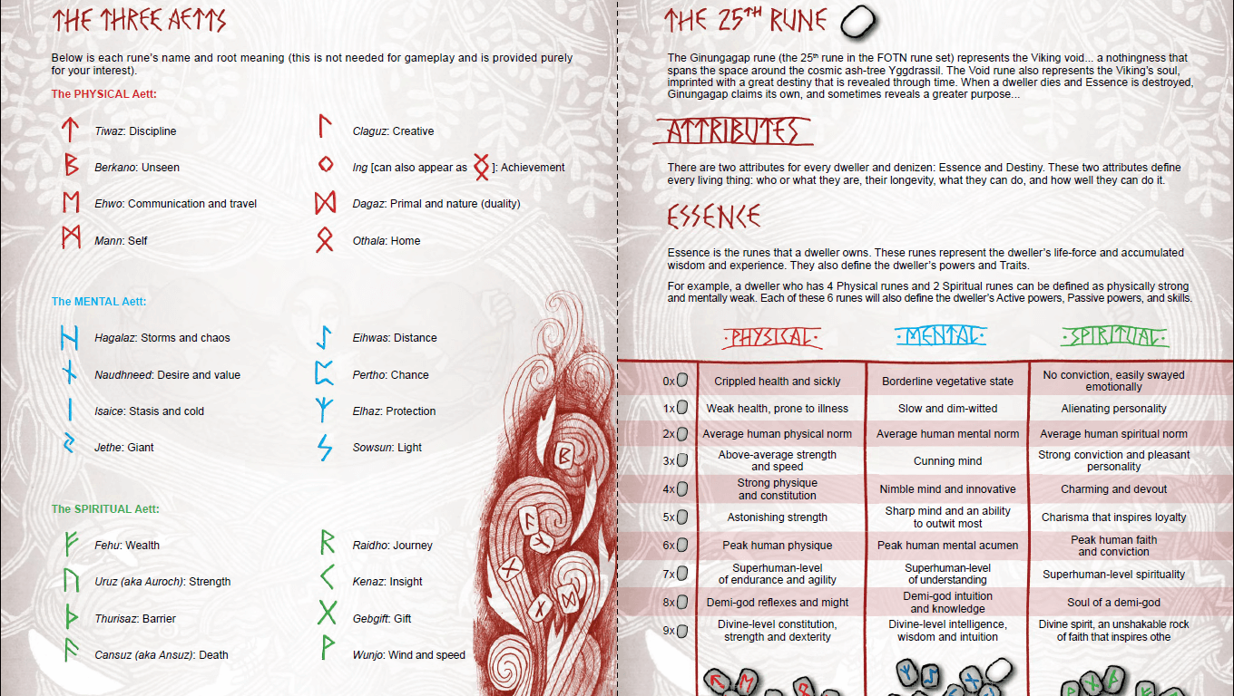Taking place in the winter years after Baldr’s death, Fate of the Norns: Ragnarok eschews dice in favor of runes from the Futhark alphabet. Your character’s attributes are the runes you have in a bag, split between physical, mental, and spiritual for red, blue, or green runes. Player characters also have a Void rune that you customize at character creation. Your character is made up of Essence, the composition of runes in your bag, and Destiny, the number you draw for a skill check. Those checks require drawing a rune, comparing the number to the corresponding feat you are trying to achieve, and modifying if you have a relevant skill. You then compare to the difficulty value of 1-5, getting a marginal success if you are within 1 or 2 of the difficulty value. Characters are modified by those skill values and special abilities that mostly come into play in combat.