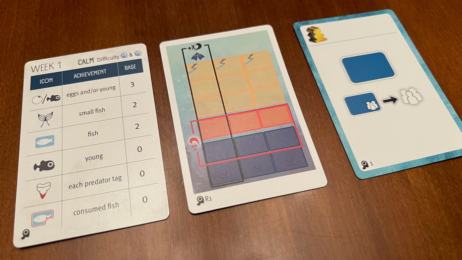 While the solo player will take turns normally, Nautoma’s turns are taken by flipping over cards from a special deck. On their turn, they will flip a new card. First they will either place a diver on their achievement card or take one off. Then they will take either a dive or play a fish action. Since Nautoma does not use a player board, a dive action consists of converting tokens, such as eggs to young, young to schools, and gaining more eggs. On the play a fish action, Nautoma draws a fish from the deck and activates any “all players benefit” when played actions. Likewise, Nautoma will gain eggs when the solo player activates or plays an all benefit card.