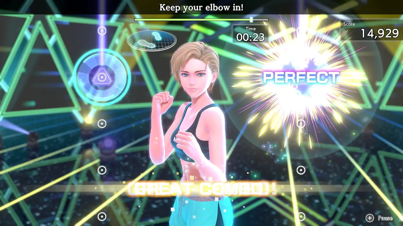 You see, the gyroscope function is limited and inaccurate. The barest motion will register a punch, and if you’re even vaguely within the time window you can expect a Perfect hit. All the directionality, different types of body movement, those are really on the honor system. You could be lying on the floor waving the controller in the air and you could probably get a perfect score. I should dislike this more, from a critical perspective, but it makes surprisingly little difference when you’re in the game. While it does deprive you from a real rhythm-game challenge, you will find yourself energized and motivated enough to keep up with the movements on your own. At least I did, and I would fain believe someone would go to the trouble of buying a boxing game, booting it up, and then choosing the easy way out just to make numbers go up on a console. Is that naive of me? Maybe. It is a drawback, but one that does little to detract from the energy in the room while you’re moving around, punching and dodging to the beat.