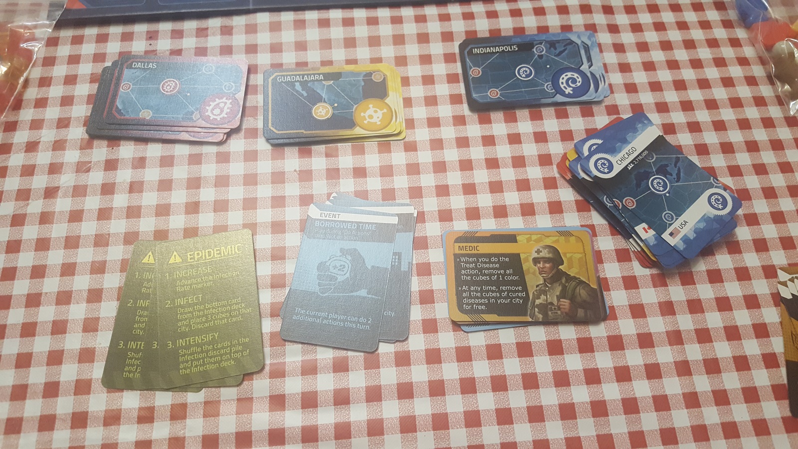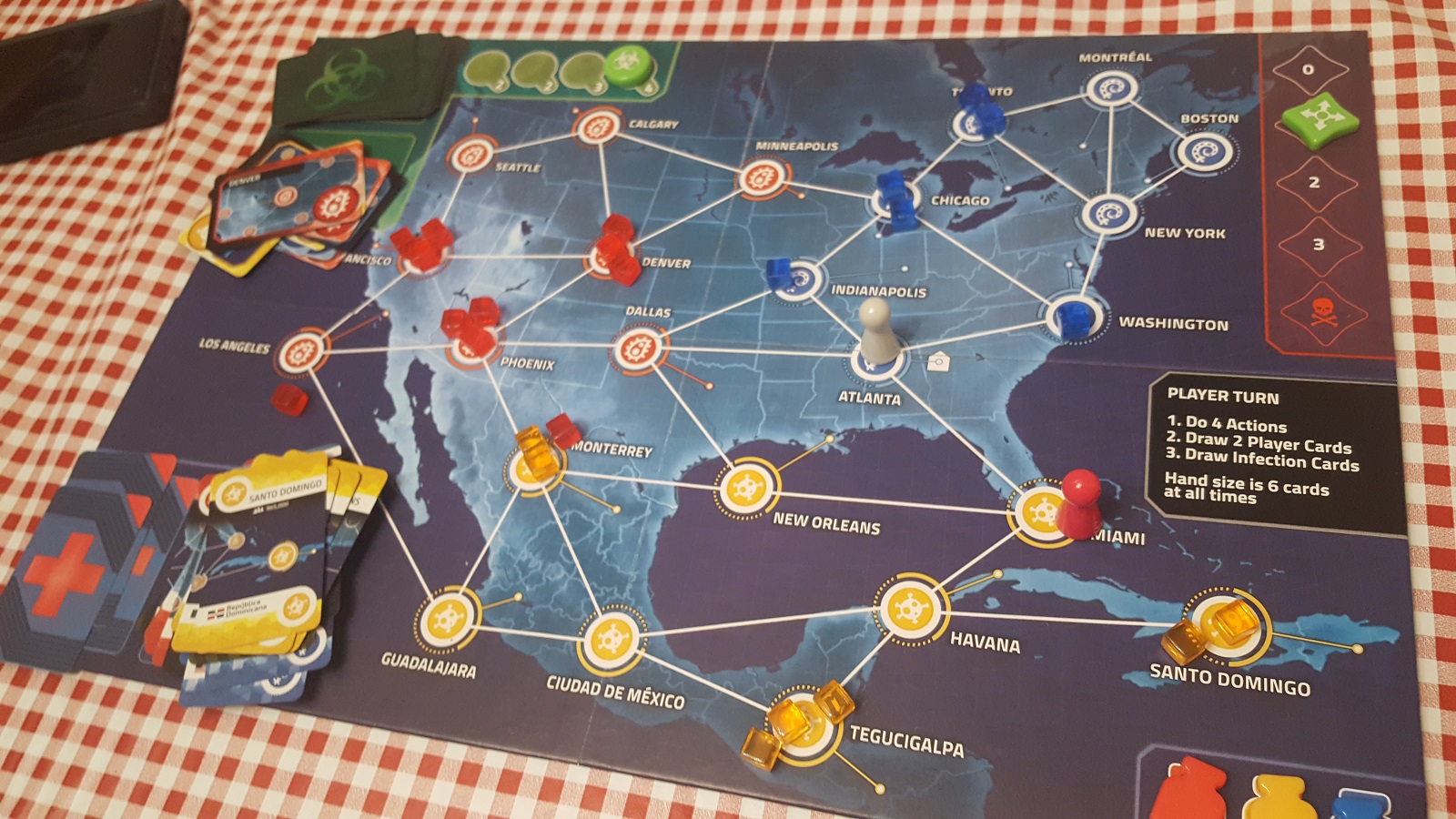 At the end of each player turn, you’ll have to pick random city cards which will get infected with respective cubes. Additionally, there are crisis and epidemic cards that will make your journey harder. If you exceed three cubes of the same color in any city, an outbreak occurs, and surrounding locations get infected as well. If you do this enough times, you’ll end up losing the game.