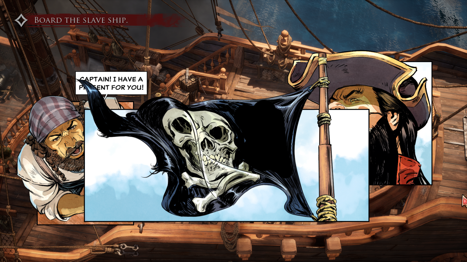 Let’s talk about the story first. It’s about… something. There’s a magic ruby. Flint is soul-bound to some kind of witch because of… reasons. Your best friend dies. But also maybe he doesn’t. There are a bunch of other crew members that don’t matter at all. I think they are supposed to be pirates? Honestly after completing the game, I’m not really sure what I was supposed to be doing or why. The story is told through a combination of cutscenes, comic strips, and speech bubbles that make it very disjointed and hard to follow. The ending made no sense and all of the proceeding chapters were just the stereotypical escape from prison and rebuild your squad. Strong and original? I think not.