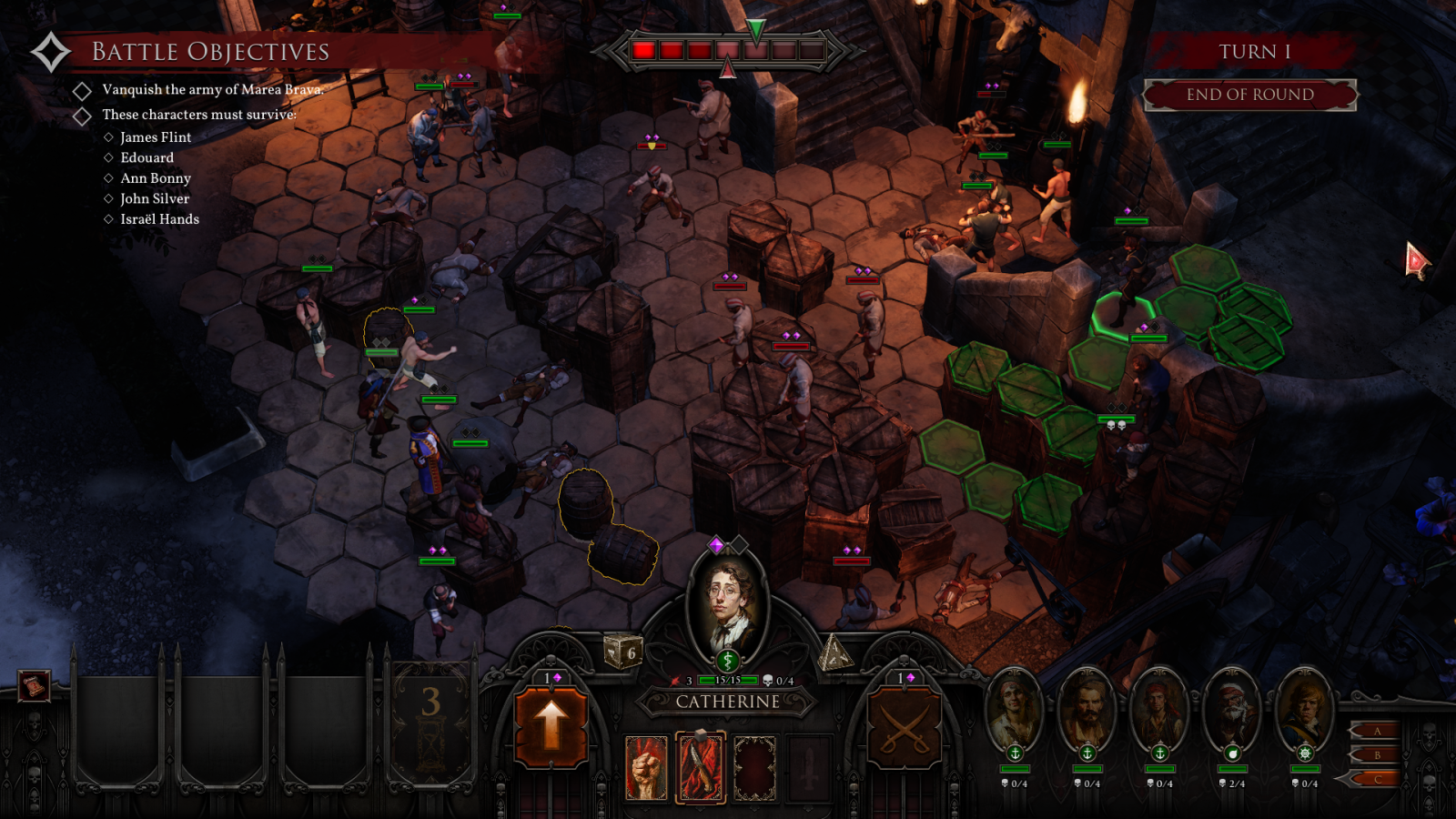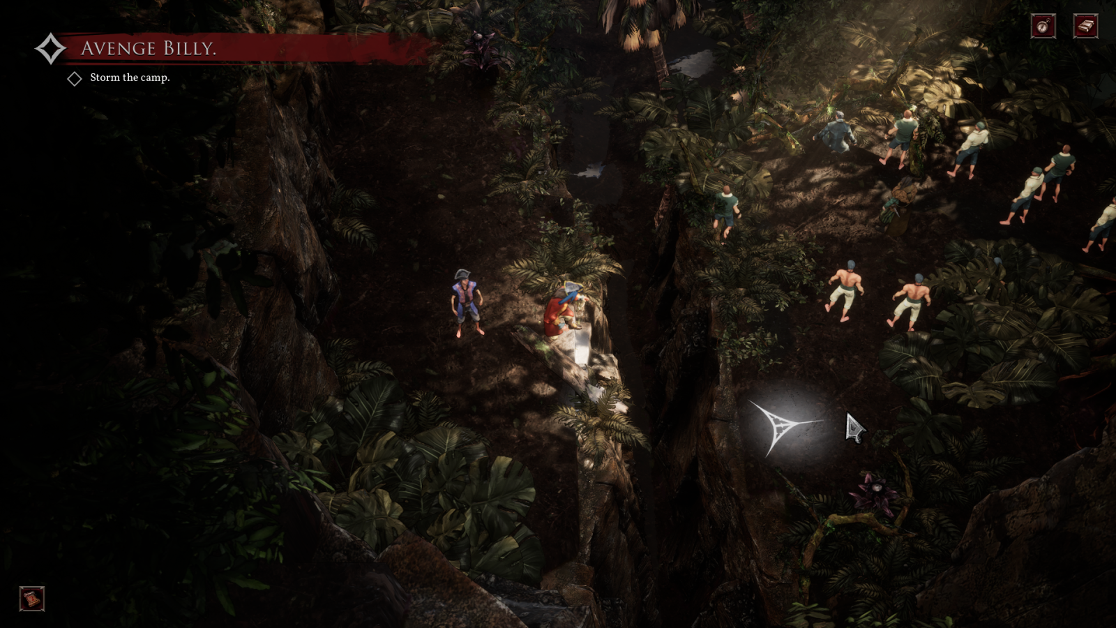 The actual combat revolves around a TTRPG-style dice system. Every attack requires a dice check to see if you hit, miss, how much damage you do, etc. If you’re lucky, you can instantly kill. If you’re unlucky, you can miss and your weapon will break. Have fun punching everyone to death. It’ll happen. Besides the swing of the dice, combat is fine if not terribly interesting or fun. From beginning to end, all of the encounters feel the same. The most interesting thing enemies will do is hurt themselves jumping off cliffs to take the most direct path to you. I lost a few crew members along the way but there was very little challenge or anything to make you think beyond clicking on the enemies closest to you. The exception being when you can use the small height changes and rolling barrels to wreak havoc on the enemies. Sure hitting someone with an axe might do a little damage but have you ever rolled a medium-sized wooden barrel into anyone or jumped on them from a small height? You get comically huge damage numbers out of these terrain elements. Rolling a barrel into someone is always better than slashing them with a sword or shooting them with a gun.