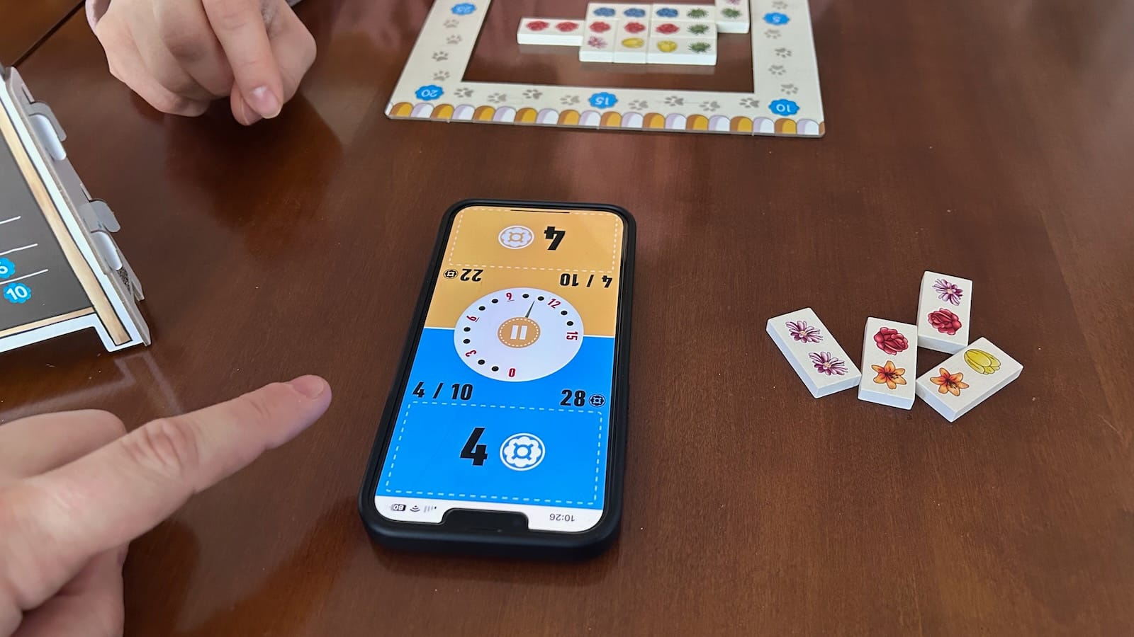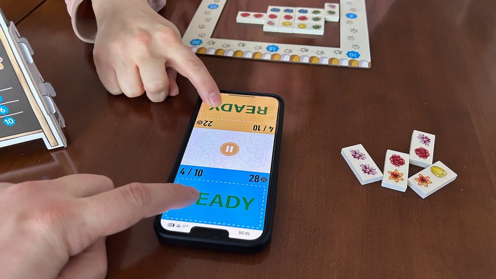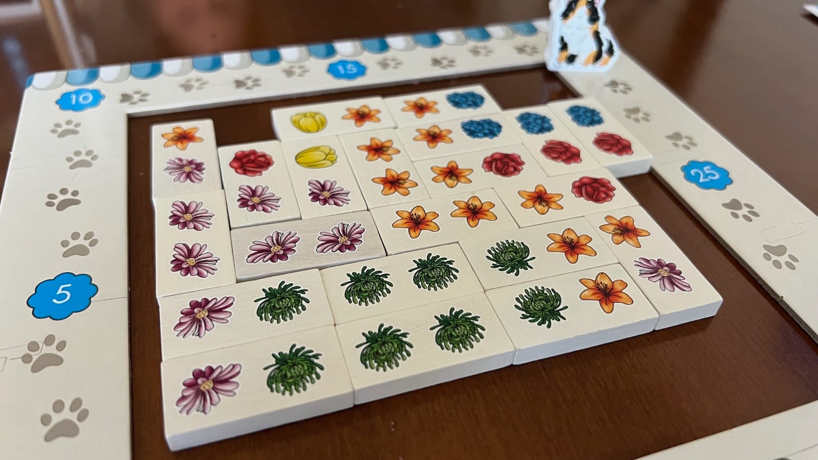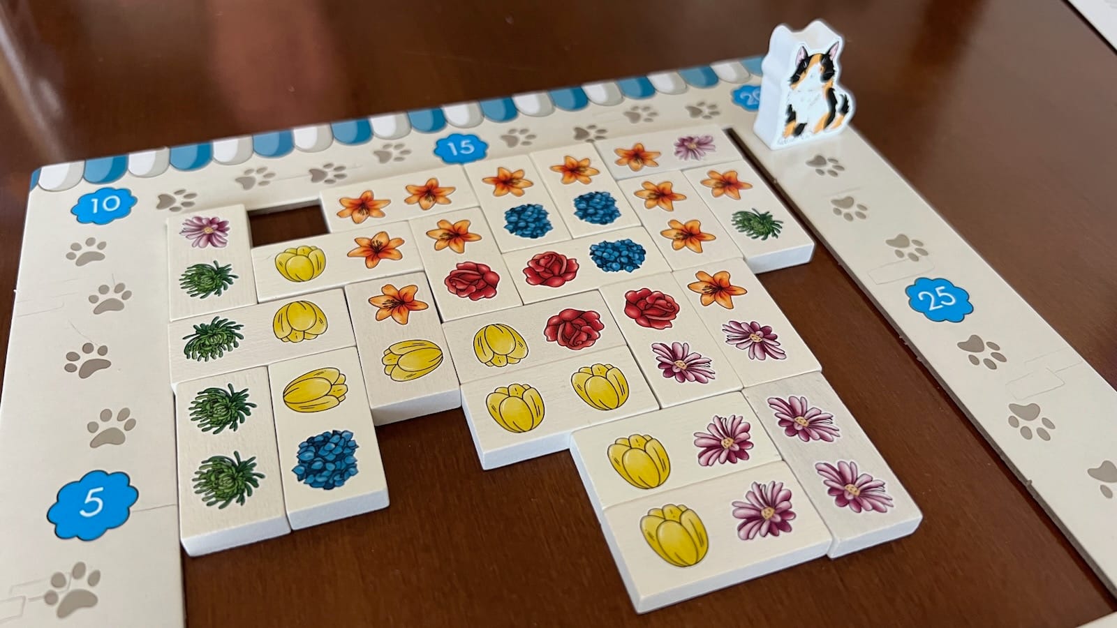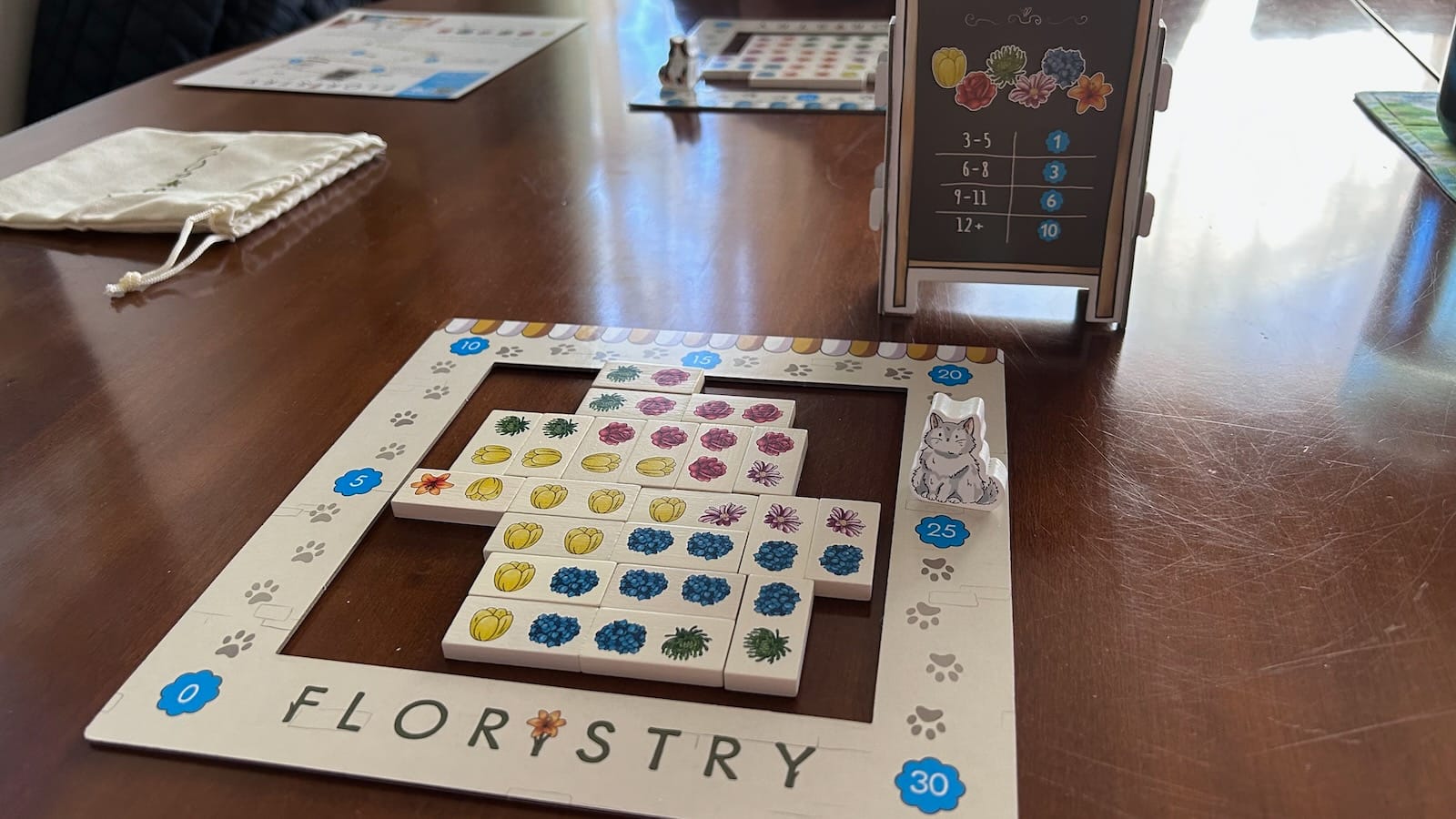 The game continues over 10 rounds with all tiles being used from the bag. The app will then walk through the scoring rounds with players tracking scoring with a cat token around their frame. Players will score their largest grouping of each flower varietal with groups scoring 0-10 points based on their size. The player with the most amount of money at the end of the game will subtract the other player's total from theirs. That player will then compare this score to the same table used for the player to get bonus points. The player with the highest score wins!