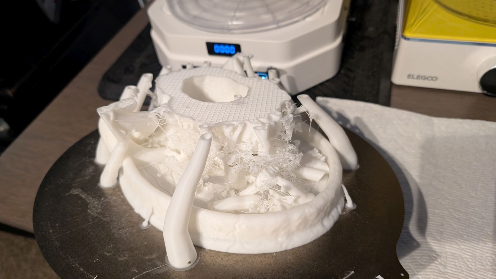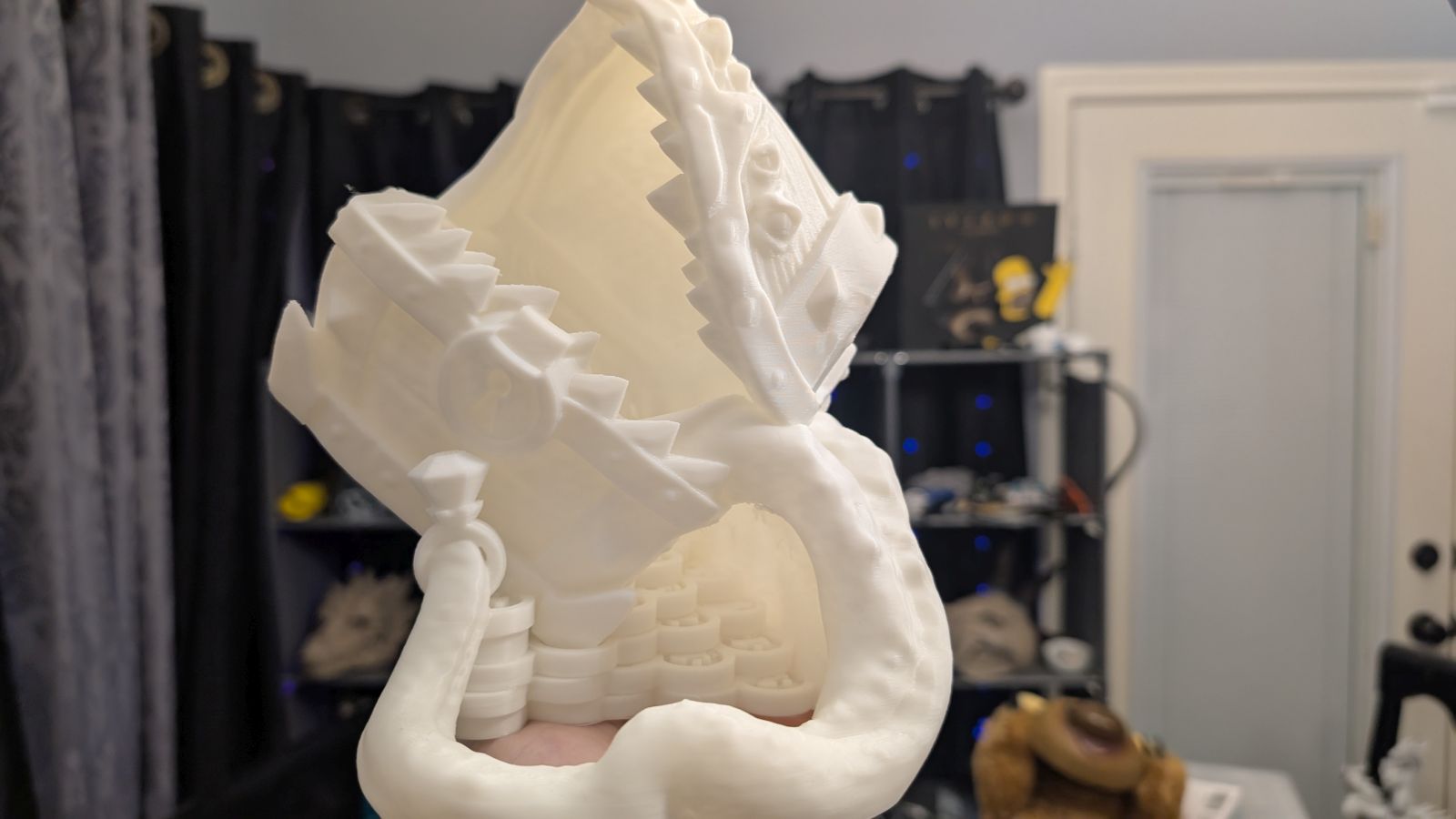 With that brief look under the hood out of the way, it was time to print. Just like last time, I wanted to print a large, free-standing structure with minimum reports and without a lot of cleanup work required. This time around, I picked an awesome Mimic dice tower that I’d print in white high-speed FDM. I scaled it up to 160% to utilize more of the Z-height without making it ridiculous. This’ll handle a good grip of dice without any trouble. Unsurprisingly, the S1 Pro made light work of it, kicking it out in just 10 hours and 19 minutes.