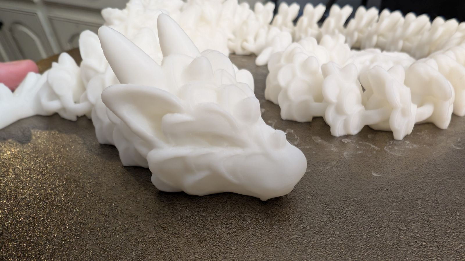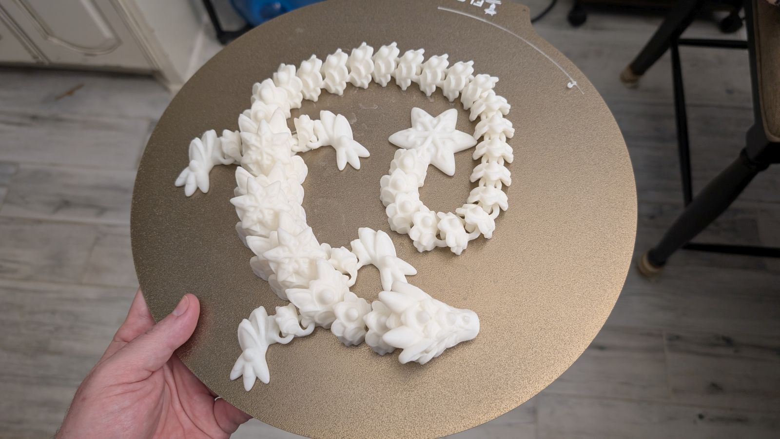 The next thing I printed was a request from the missus – a Gingerbread Dragon. These are just like the typical articulated dragons you see everywhere, but with some gingerbread cookie and star decorations on the individual segments. This took the S1 Pro just over 2.5 hours to print, and as you can see below, came out perfectly without the need to do anything other than pop it off the flexible plate.