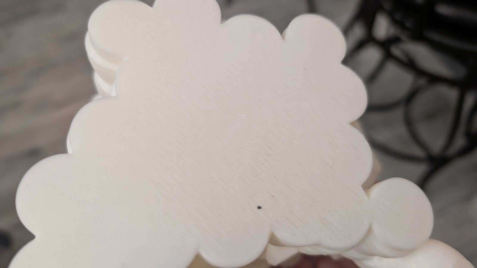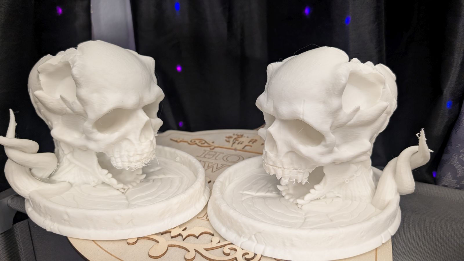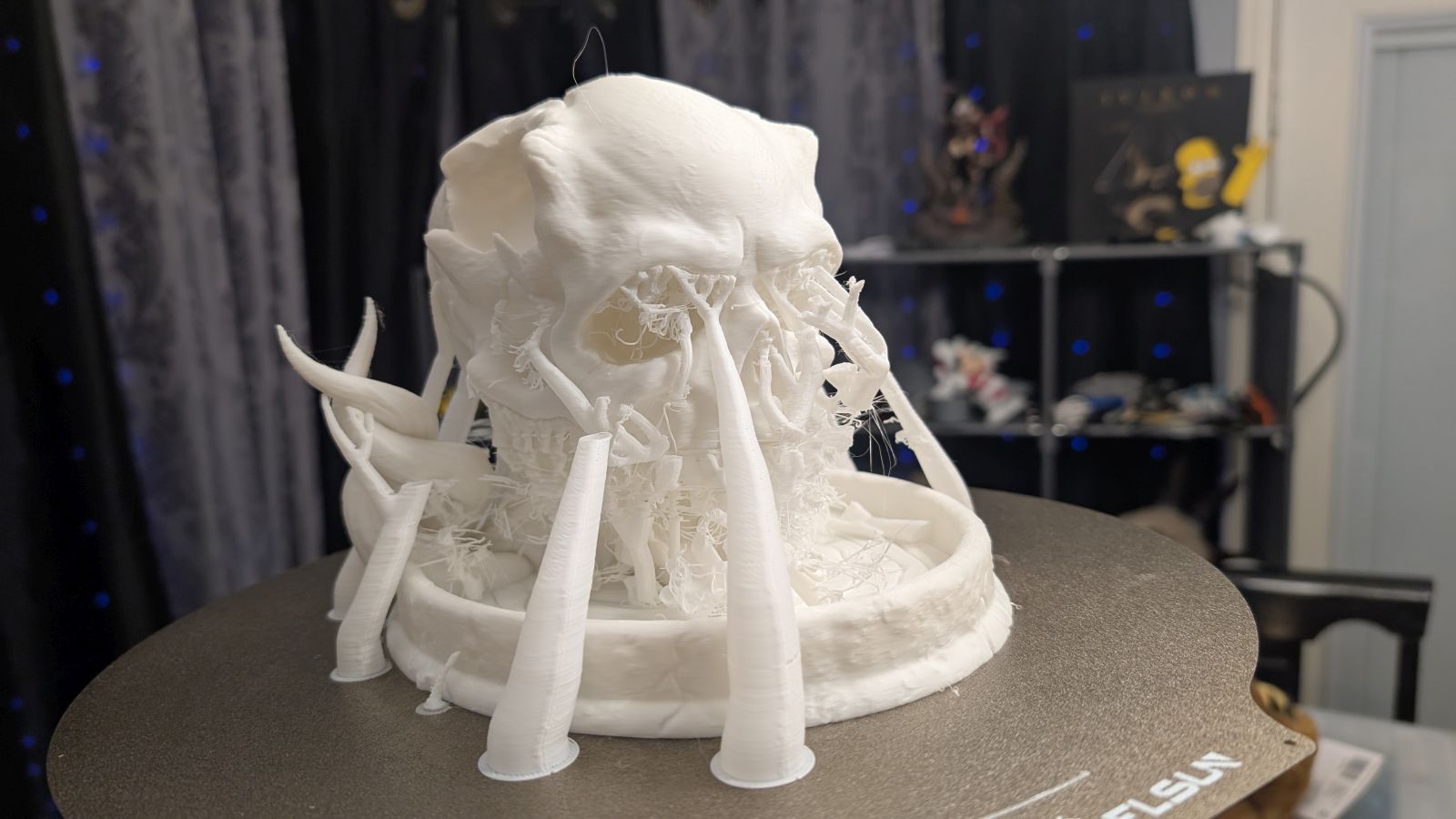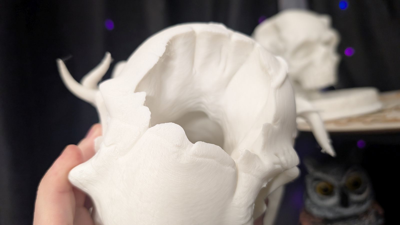 The last thing I printed was another dice tower – a skull with horns. If the spaghetti option was turned on, it’d have alarmed like crazy. On the other hand, what came out was actually pretty solid. There’s one small separation on the teeth that, since this is a skull, can be fixed and simply made to look jagged, salvaging the entire thing. Obviously that’s me making lemonade out of lemons – it’d certainly be better to slow this down to prevent the stringing. In this case, however, it wasn't the speed but the material. The first spool of filament I was using was standard PLA I had left over from another project -- standard non-high speed stuff. SUNLU had recently set me up with some white HS_PLA for a project, and I knew the high-speed material was better suited. Sure enough, my second and third print were both successful (minus the teeth from bad supports as mentioned above), and without any stringing. Using the right material for the job makes a world of difference.