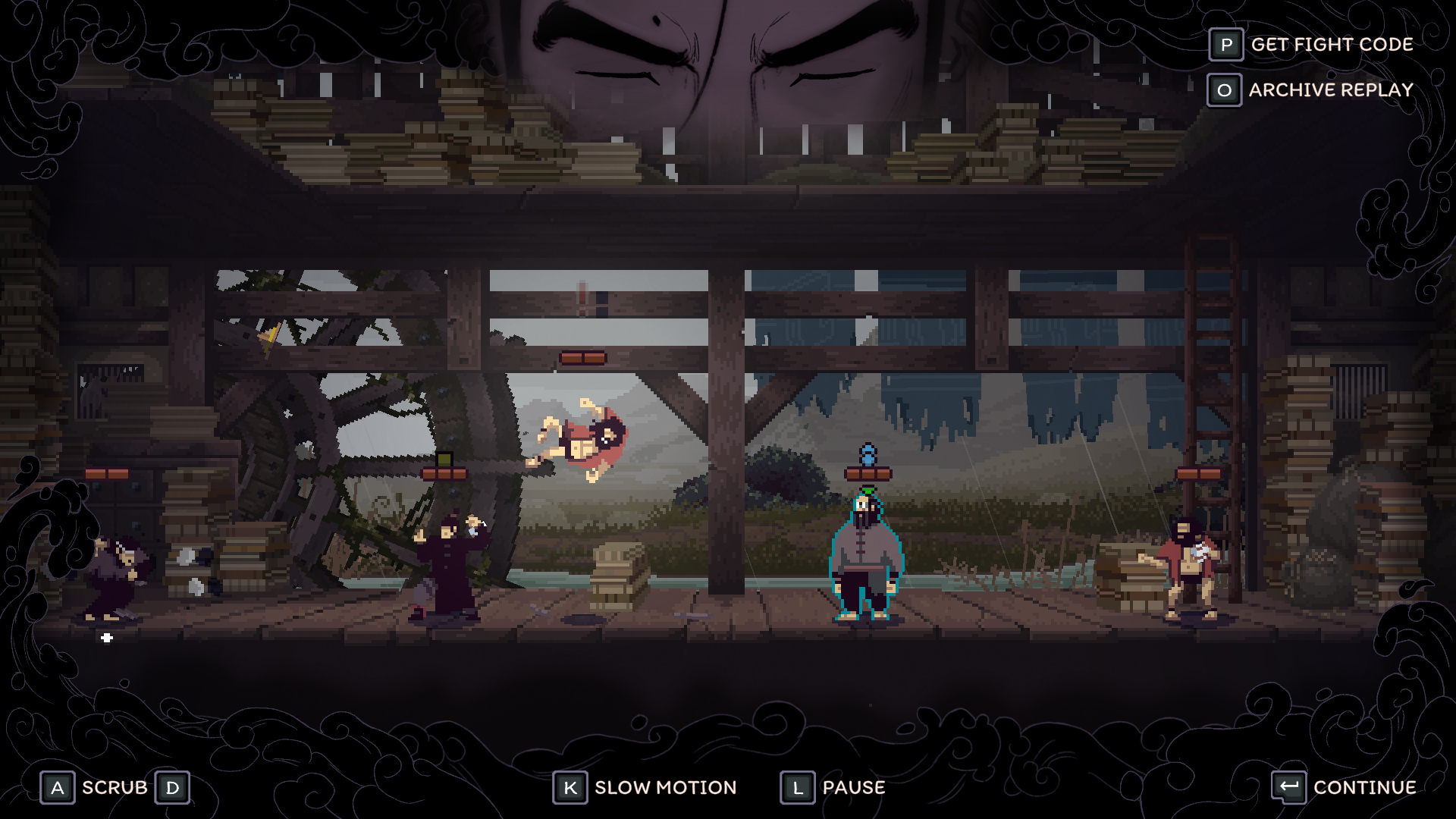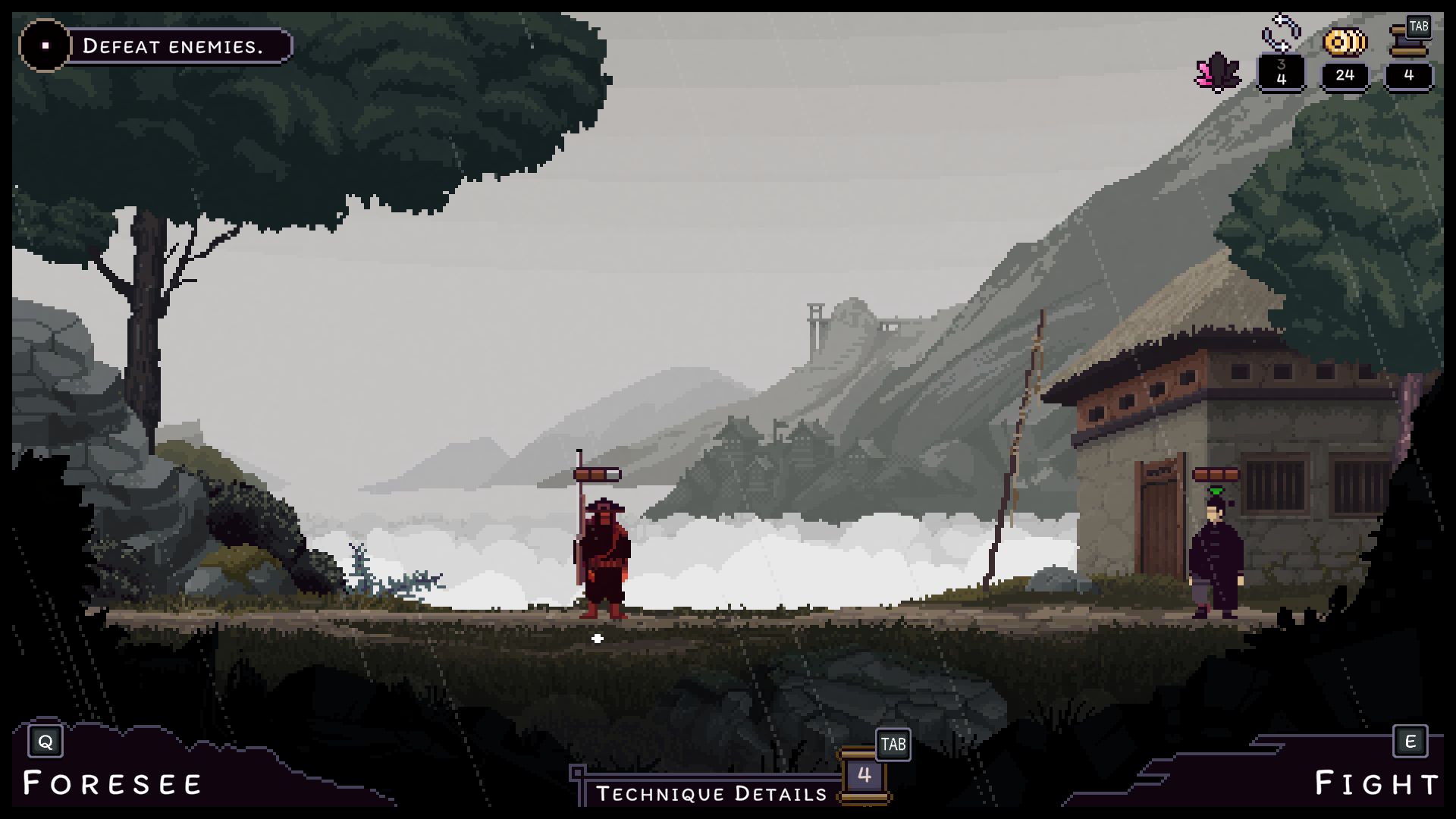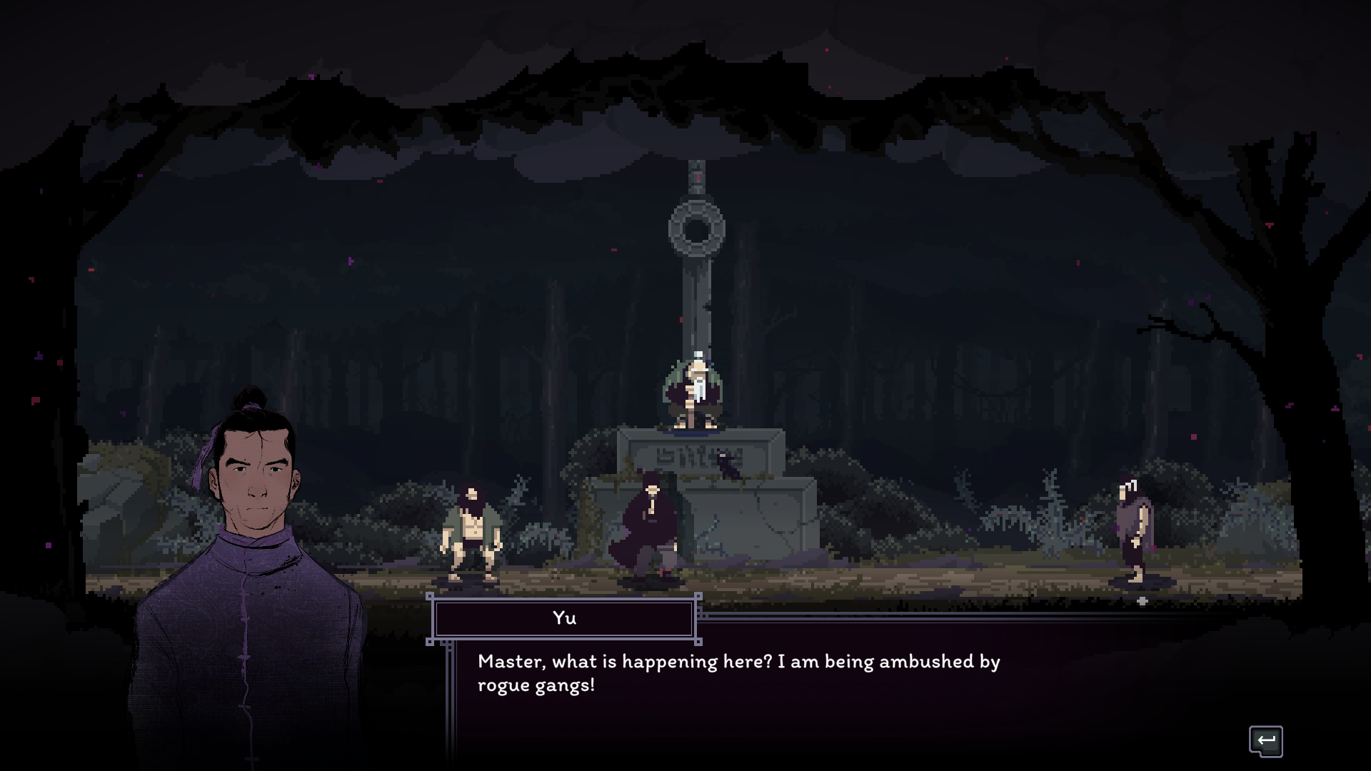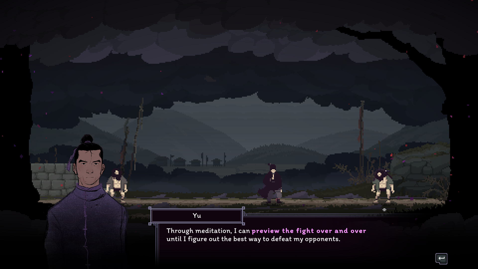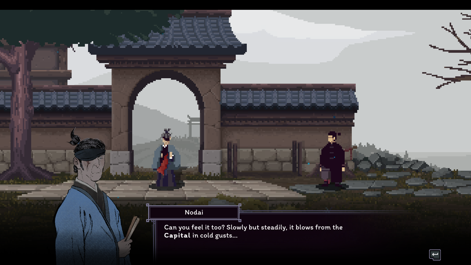 That being said, when the game works, it works well. There’s something so thrilling about planning out your strategy and backup plans and executing them perfectly. The game even gives you a post-fight rewind, complete with a pause, play, and scrub feature so you can watch your moves play out. The animations and sprite-work are simply excellent, and I was never left guessing about an enemy’s attack range. It’s all telegraphed well. Beyond the function, there’s an abundance of beauty everywhere you look. The monastery and countryside are run-down and overtaken by nature, using a lot of greys and murky greens to illustrate that. The hand-drawn character portraits are expressive during dialogue, and they do a great job of reflecting the characters' personalities. Master Nodai might be my favorite of them all, with his cold, guarded demeanor occasionally contrasted by outbursts of fervor, revealing the bottled rage that shapes and fuels the Cold Eye technique. I personally enjoyed talking with all of the characters, and story moments felt impactful and well-paced, which is hard to achieve in a rogue-like. The sound design is also quite excellent. Punches and kicks sound meaty, lending weight to the combat. The background ambiance fits the zones, like the bugs chirping in the countryside. The music is traditional, with lots of string instruments to hype you up during the battles.