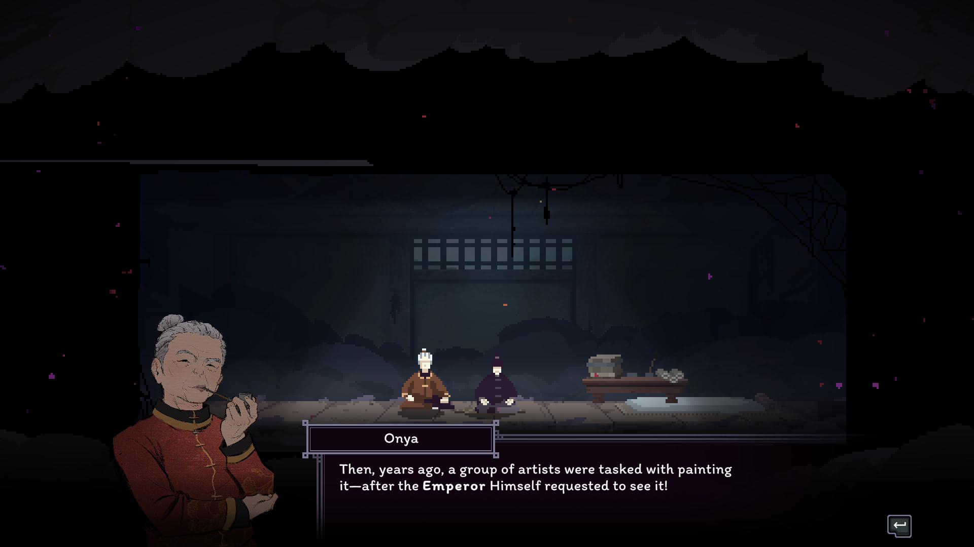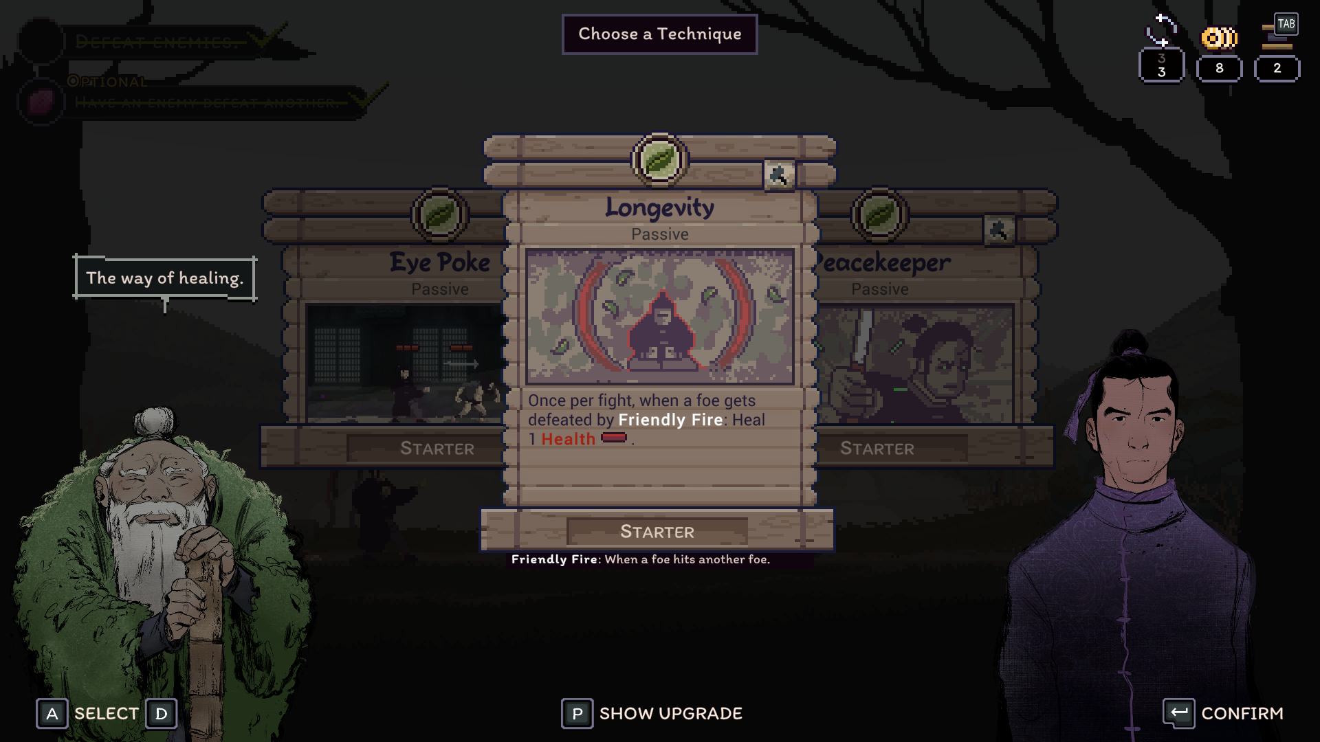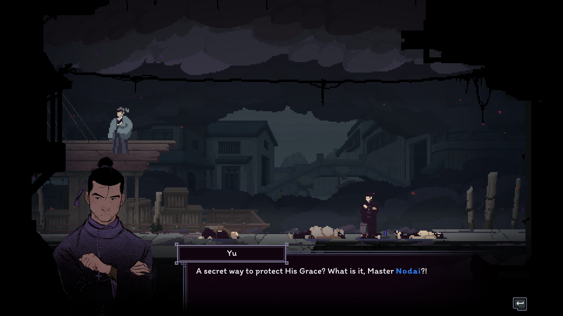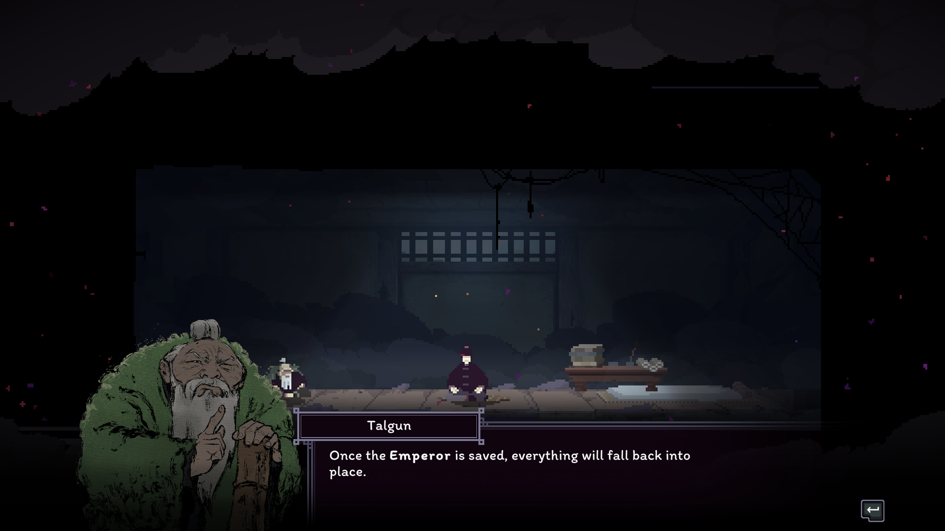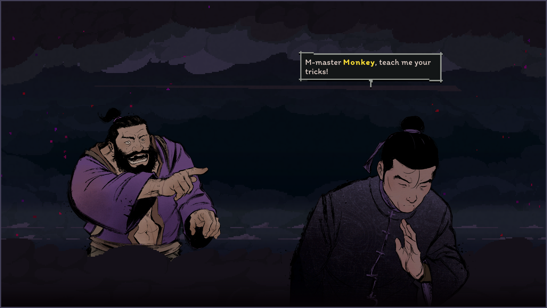 That being said, when the game works, it works well. There’s something so thrilling about planning out your strategy and backup plans and executing them perfectly. The game even gives you a post-fight rewind, complete with a pause, play, and scrub feature so you can watch your moves play out. The animations and sprite-work are simply excellent, and I was never left guessing about an enemy’s attack range. It’s all telegraphed well. Beyond the function, there’s an abundance of beauty everywhere you look. The monastery and countryside are run-down and overtaken by nature, using a lot of greys and murky greens to illustrate that. The hand-drawn character portraits are expressive during dialogue, and they do a great job of reflecting the characters' personalities. Master Nodai might be my favorite of them all, with his cold, guarded demeanor occasionally contrasted by outbursts of fervor, revealing the bottled rage that shapes and fuels the Cold Eye technique. I personally enjoyed talking with all of the characters, and story moments felt impactful and well-paced, which is hard to achieve in a rogue-like. The sound design is also quite excellent. Punches and kicks sound meaty, lending weight to the combat. The background ambiance fits the zones, like the bugs chirping in the countryside. The music is traditional, with lots of string instruments to hype you up during the battles.