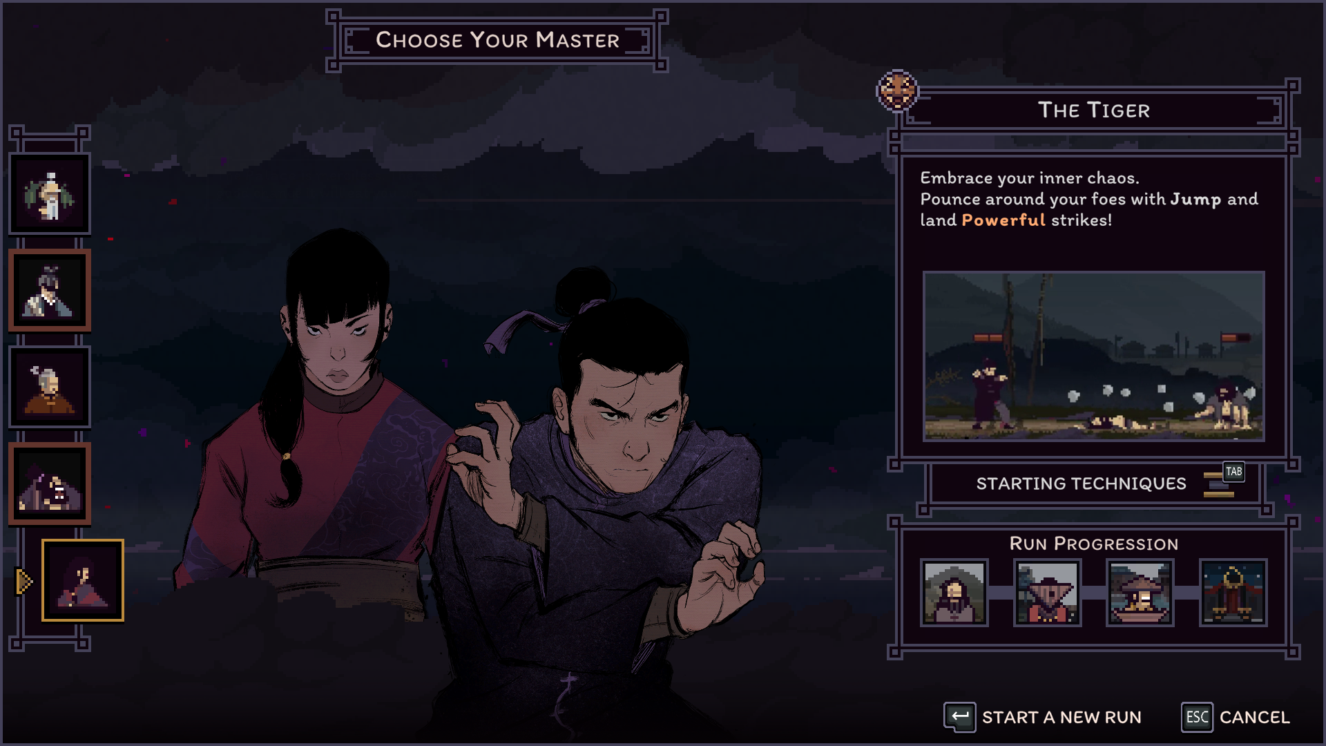 At the start of the game, the only school of Foresight available is Master Talgun’s School of the Leaf. This school emphasizes dodging and letting enemies take care of each other. After a few runs, you’ll meet stern Master Nodai, and you’ll gain access to his Cold Eye technique, which is all about blocking and retaliating in kind. Then you meet Master Onya, whose school of The Storm focuses on precise attacks to decisively remove opponents from the board. Next up is Monkey, who’s not really a master of Foresight; he’s just a wild man who trespasses on monastery grounds and fights like a monkey. The humble Yu takes note of this fighting style, adopting drop kicks and trickery under Monkey's influence. Finally, there’s Yu’s childhood friend, Buton, and her Tiger fighting style, which dishes out devastating special attacks that keep Yu mobile. After the first fight of every run, players can choose a starting technique from their chosen style. In addition, choosing a fighting style and master before a run will affect which in-run upgrades you have access to, which uses the familiar ‘pick-one-of-three’ rogue-like system to gradually augment your moveset. Players will also unlock new techniques as they progress through the game with the various masters/teachers.