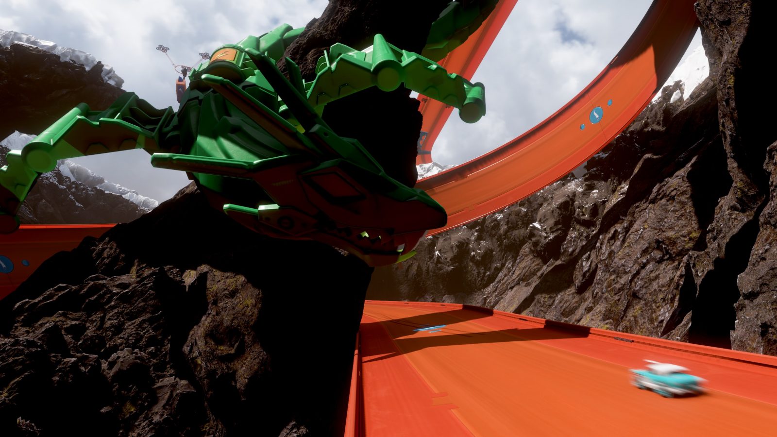 Before we get into the nitty-gritty, let’s talk about the new zone the expansion takes place in. Hot Wheels Park is essentially a floating island with three distinct zones connected by the iconic orange tracks. In the north is the jungle/forest area, complete with waterfalls and gorges. Southeast is Giant’s Canyon, a mountainous area with tons of loops and corkscrews. Southwest is the Ice Cauldron, which frozen surface belies an underground inferno of lava. In the center of all of these is of course a hub that connects them all, while also providing its own unique set of driving challenges. While you can drive off-road in some areas, it can be difficult to find your way back on the track seeing as they’re mostly suspended in the air and have walls to prevent you from falling off. Thankfully, while you’re here fast travel is completely free and available from the get-go, so if you’re in a hurry you can just teleport wherever you want.