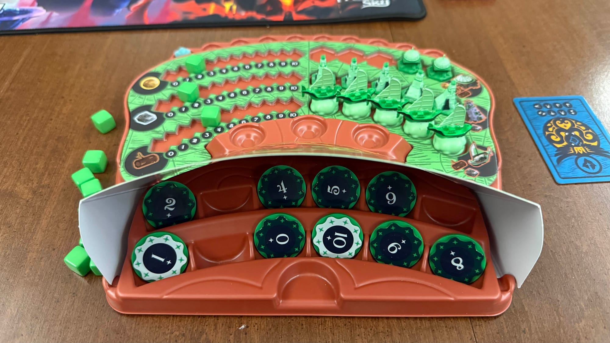 Player trays display available units and resources to everyone, but the bidding chips are hidden behind a screen