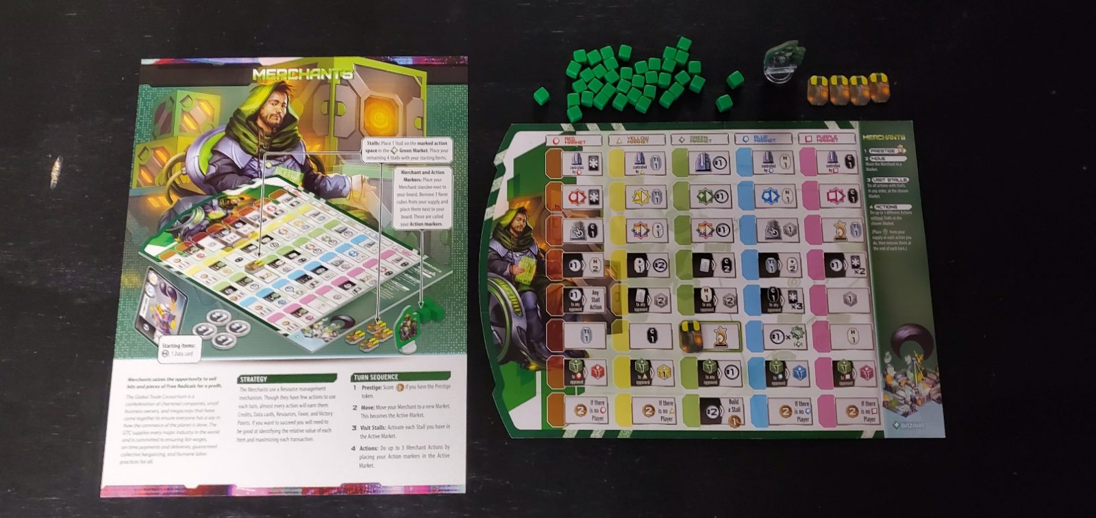 The Merchants have super-simple gameplay and were not a particularly popular choice in games I played. You move the Merchant marker to 1 of the 5 columns you aren’t currently in, take an action for any of your stalls built in that column, and then take any 3 other actions in that column. The Green column has an action that allows you to build a stall anywhere you don’t already have a stall, and you can have a maximum of 5 stalls. For the most part, the Merchants just exchange 1 resource for slightly more of another resource.