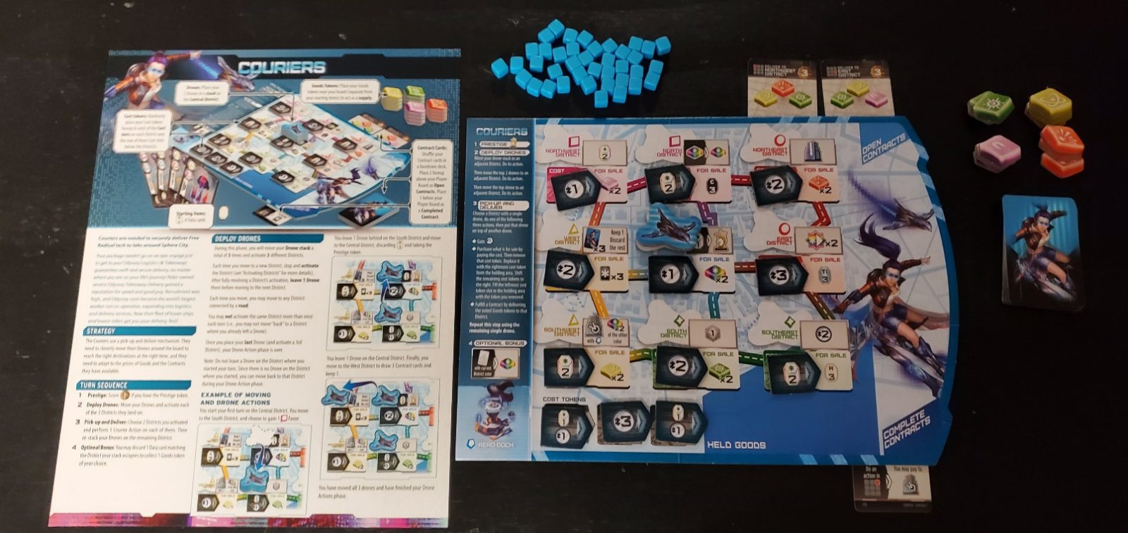 Surprisingly, the Couriers play a pick up and deliver game. You pick up your 3 drones and lay them down in a series of adjacent spaces starting with a space adjacent to where you picked them up from. You resolve the top action of each space you place a drone in the order you placed them. You then pick up 1 of your drones at the end of your train, then the middle drone, and then place the removed drones on top of the remaining drone. For each location starting where you picked up the first drone; you then gain 1 credit, buy what’s available for sale at that location, or make a delivery/fulfill a contract. Completing contracts gains you both VP and certain bonus actions if you have a drone in a corresponding space on future turns.