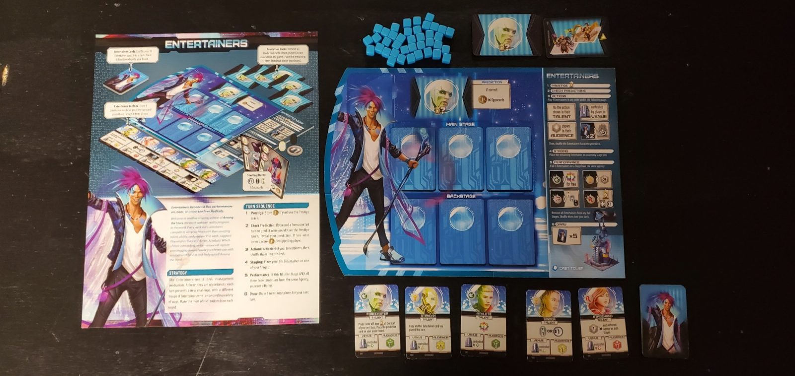 The Entertainers are very random, but (surprisingly) were still competitive. As the Entertainer, you get dealt 5 cards at setup up and at the end of each turn from a 12 card deck. Each card has 3 possible actions available on the card, with a fourth possible action being playing 2 cards to allow you to Awaken a building. You have to play 4 of the 5 cards and place the remaining card on 1 of 2 stages. Each stage has 3 spaces. When a stage is full, the cards are removed from the stage and, if all 3 cards are the same color, you get a bonus. All cards not on stage are shuffled together before dealing out your new hand at the end of your turn. No one seemed to have a bad time with them.