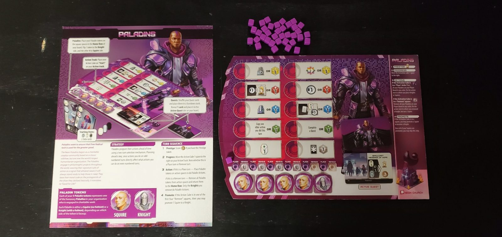 The Paladins are arguably the simplest group to play. Every odd turn, you place your 5 workers on a spot on your board and take the action listed next to it. Every even turn, you recall your workers and upgrade a worker (if able). When upgraded workers are recalled, you take the action listed next to the space they were recalled from.