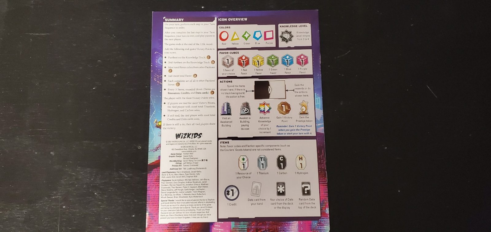 My second biggest criticism is probably that there are no individual player aids for the symbology. The only reference location is the back of the manual. 5 playing card-sized reference aids with the meanings of symbols laid out would have been very helpful. As it is, I tended to prop up the rulebook such that everyone could see the back while playing.
