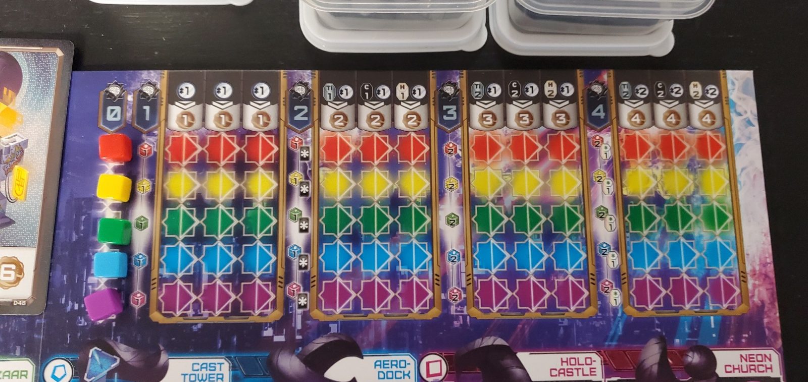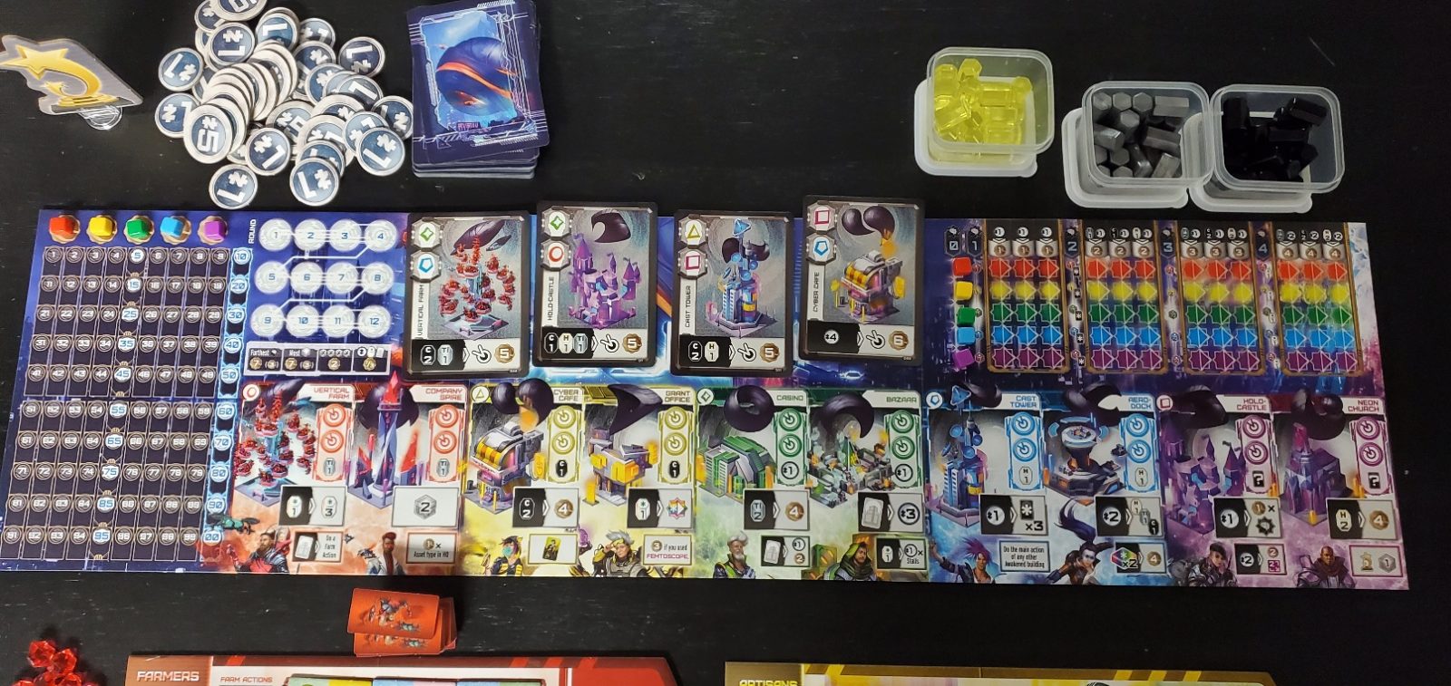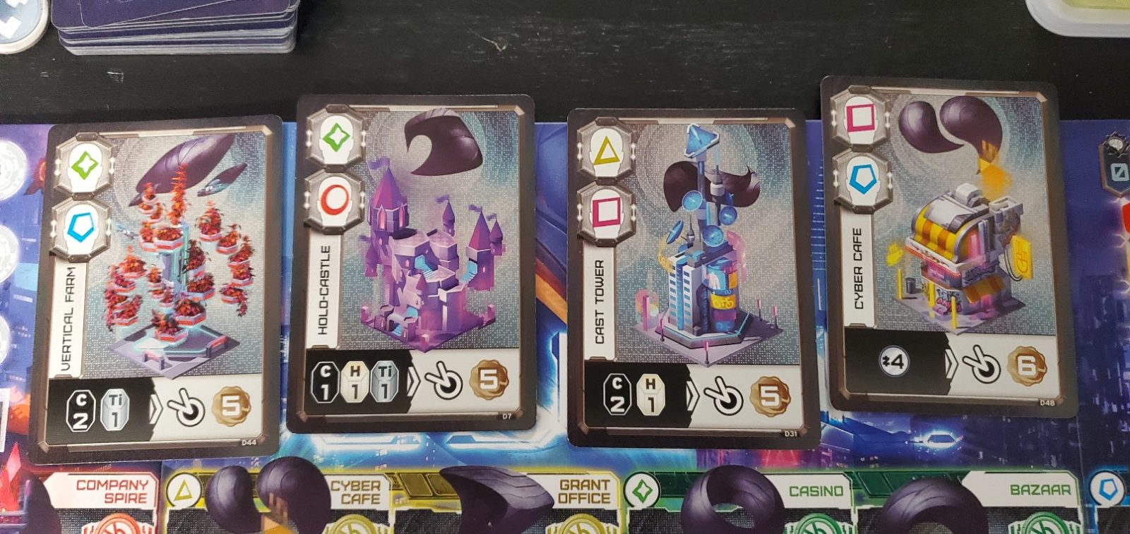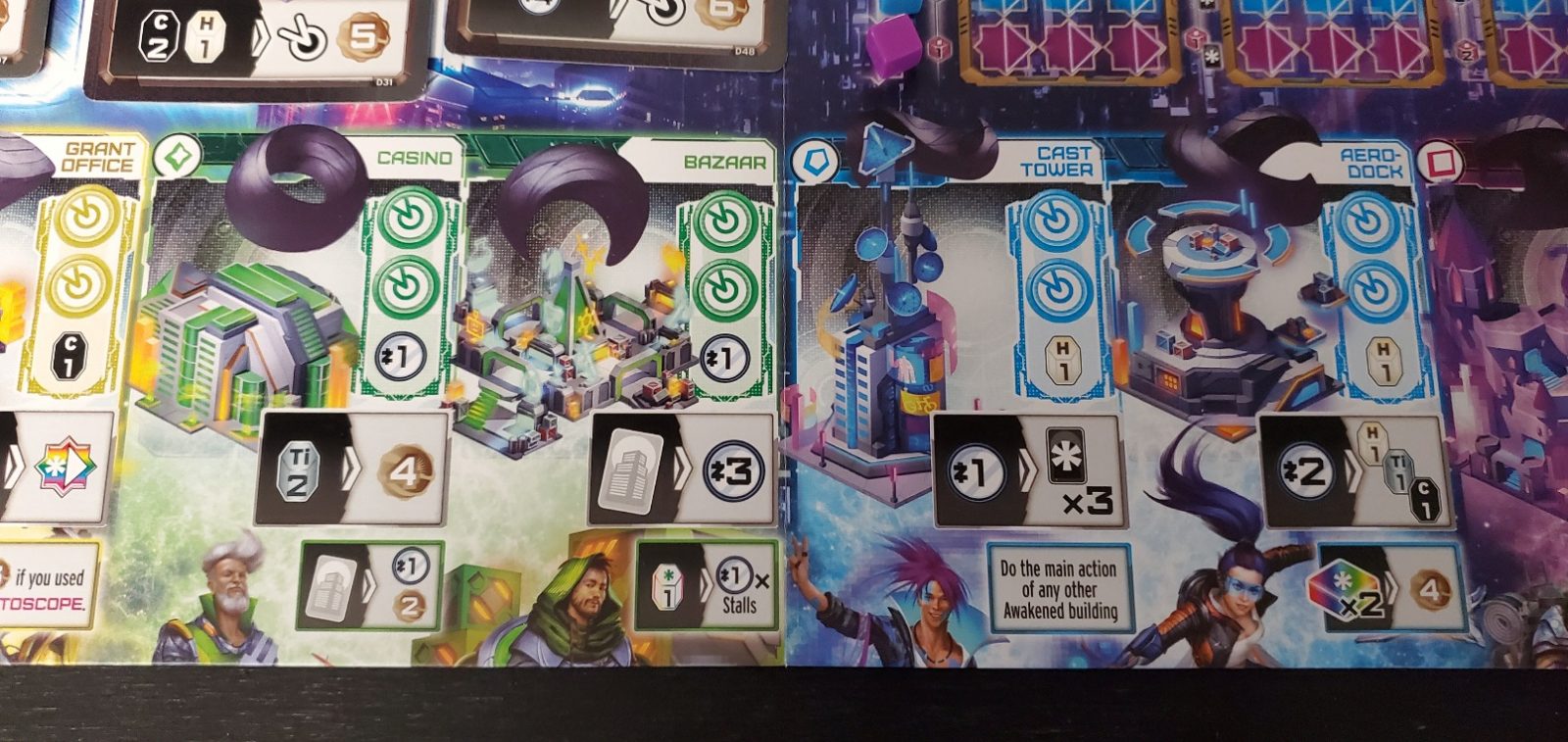 Buildings had some balance issues as well: not all buildings were equally rewarding to build. When a player visits a building; the player, or players, who Awakened the building for the overall first and second time gain a favor from the visitor and the listed item. If a single player Awakened the building for both the overall first and second times, they gain 2 favor and 2 of the listed item. As not all buildings are equally useful at all points in the game, certain buildings will likely be visited more early in the game, and are more valuable for their passive bonuses. Notably, Vertical Farm (which can convert any 1 resource into any 3 resources) and the Bazaar (which allows you to discard any Data card for 1 credit) combined with the Cast Tower were very popular in most of my games, and resulted in a lot of passive favor and item income.