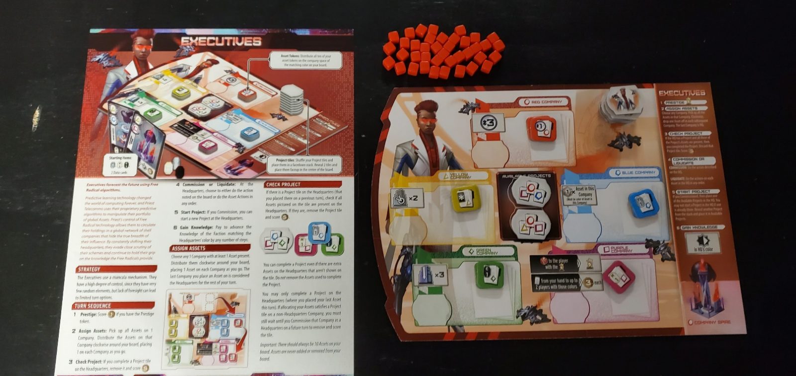 The Executives play a mancala-style game which… I’m not even going to try to explain in this limited space. Each space potentially allows you to do different things depending on what assets you have in the space you end up in. Out of all the factions, I think the Executives probably take the most planning/forethought of any faction and are probably the second most mentally demanding/hardest to learn of the factions. Not a faction I’d generally give to someone who described themselves as a casual or light gamer, unless maybe they are really into mancala.