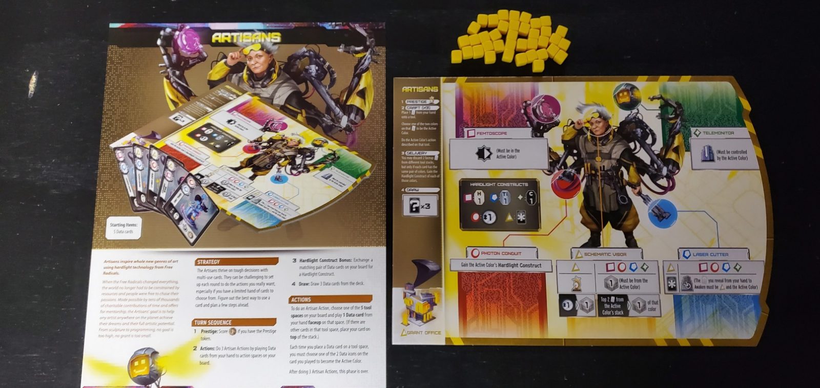 When I played them, I did ok but I didn’t really have any fun with them at all. The only other player who played the Artisans struggled hard and was not really competitive. I’d be cautious of giving them to, really, any player unless they really got excited when they took a look at the Artisan side of the yellow board.