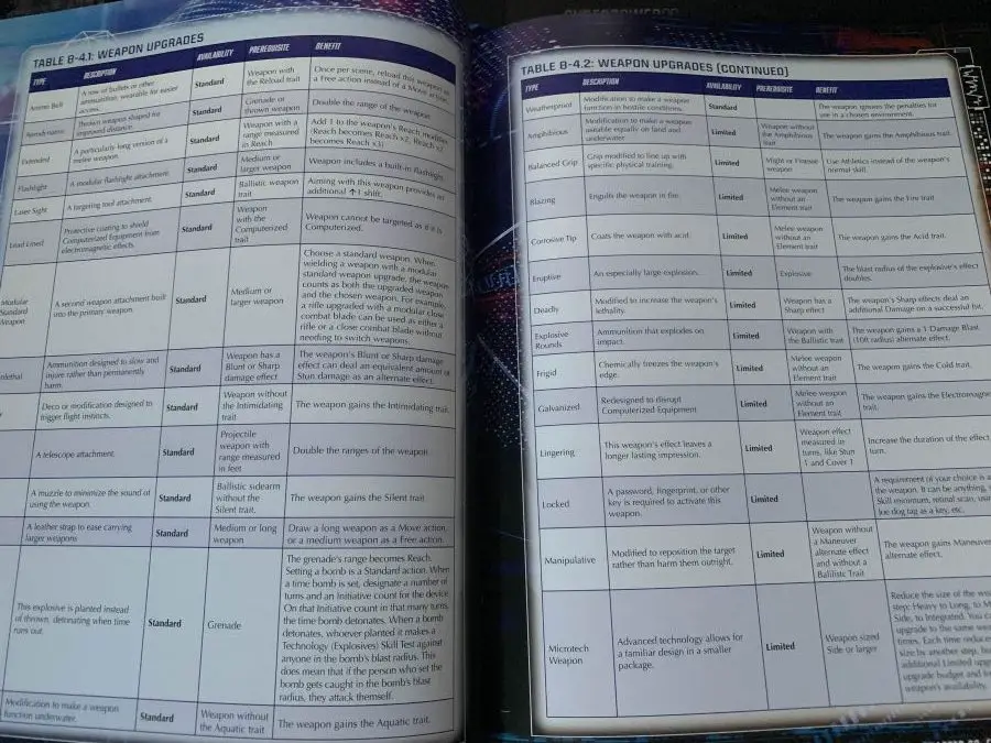 There are rules for upgrading equipment and weapons, something that a player of mine spent a lot of time doing and it was a lot of fun. Weapons are chock full of traits and effects. Some weapons are elemental, like flamethrowers and tasers, while others allow you to ignite them. The equipment section is remarkably fleshed out. The only issue is how the tables and information flow. Breaking up some of the tables would’ve been awesome.