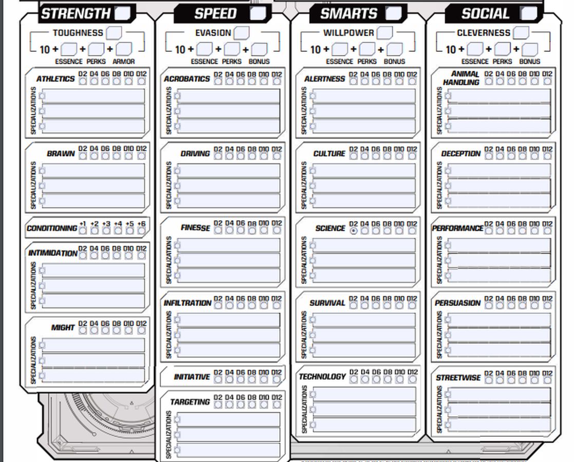 Skills are not static. You’ll have the opportunity to increase a Skill’s Rank starting with a d2 and ending with a d12. You’ll also have multiple opportunities to learn new Specializations. Skill Specializations further define what your character is good at. For example, Athletics might use Climbing, Running, and Swimming as a Specialization.