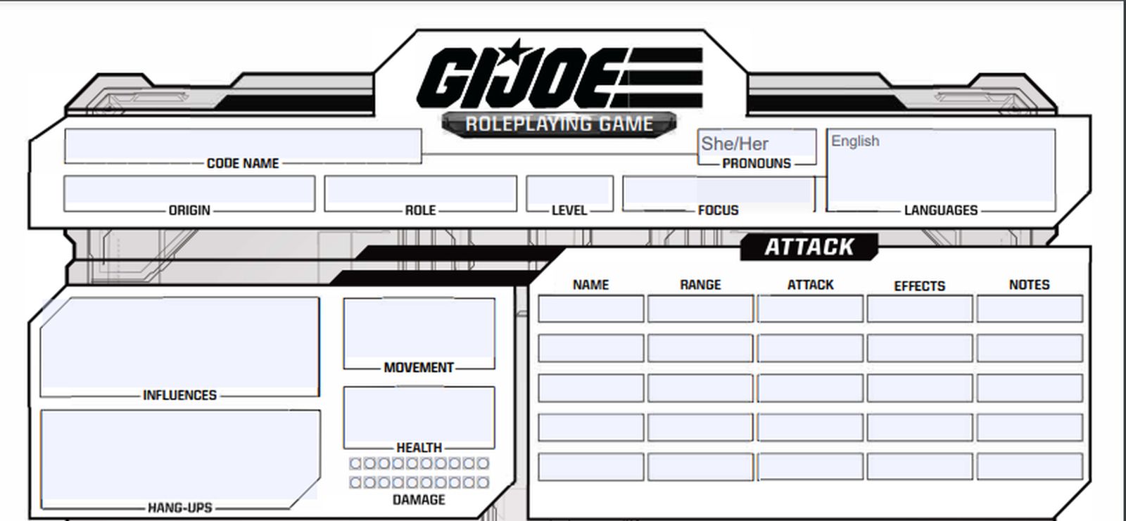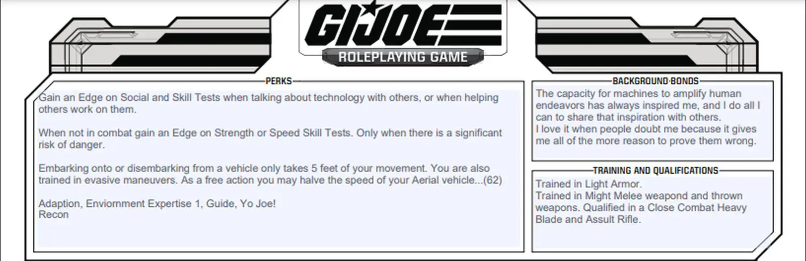 Origins are interesting too, representing the part of your character’s life that gets them noticed by G.I. Joe. Your Origin comes with a special trait, an Essence Increase, Origin Skill, Starting Health, Movement, Languages, and Origin Benefit. You’ll also be choosing an Origin Branch. There are not many words I can use to describe how much I love this. It’s extremely cool to bring your character to life this way, and this is also an extremely easy way for players to get their Health and Movement without doing too much work. When I showcase a complete character sheet, I will dive into this in more detail.
